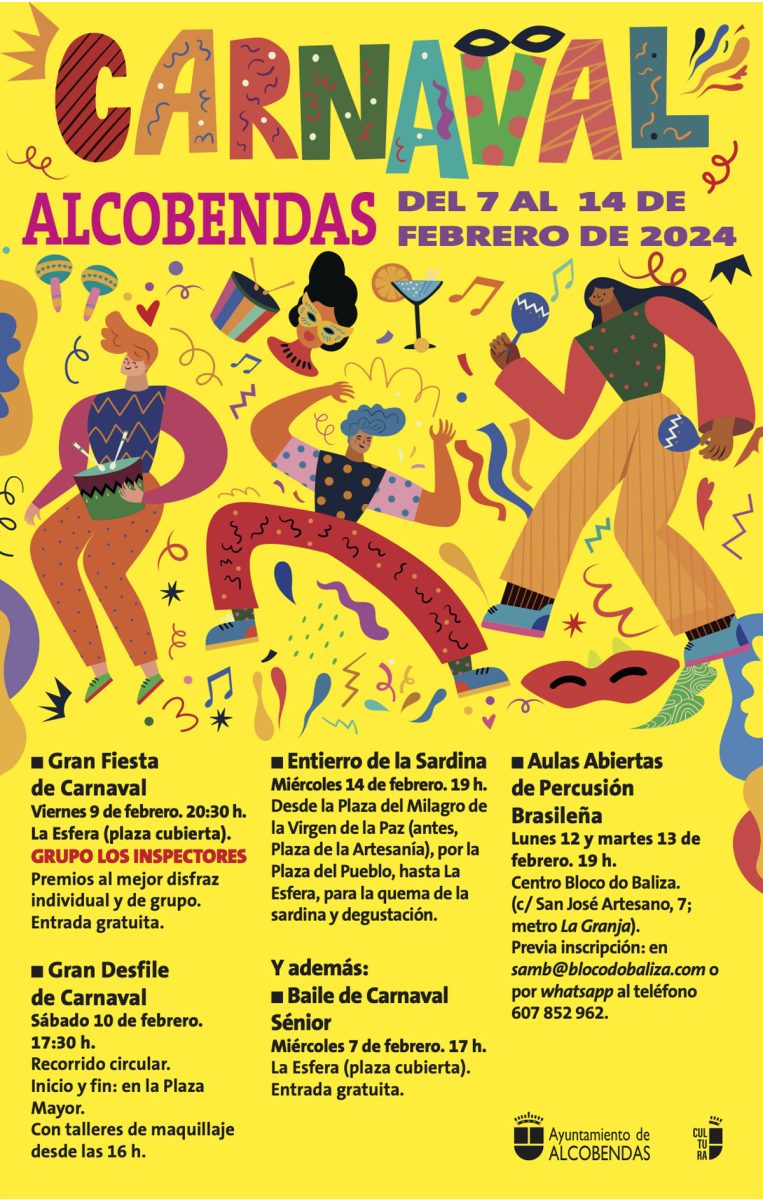 Alcobendas se prepara para celebrar el Carnaval desde el próximo miércoles 7 de febrero, con el Baile de Carnaval Sénior, hasta el miércoles 14 de febrero, cuando se celebre el Entierro de la Sardina en el Centro Municipal La Esfera.