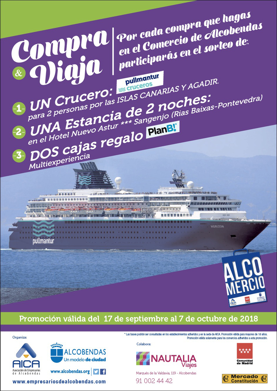 Pero no es la primera vez que nuestra ciudad organiza algo por el estilo. Este es el tercer año que los comercios locales deciden premiar la fidelidad de los clientes alcobendenses con un crucero para dos personas de la compañía Pullmantur Cruceros por las islas Canarias y Agadir, un fin de semana en el hotel Nuevo Astur de Sanxenxo y dos cajas regalo Plan B! Multiexperiencia. ¿El objetivo? Promocionar el pequeño comercio, incentivar el consumo y atraer nuevos compradores al comercio tradicional de Alcobendas.