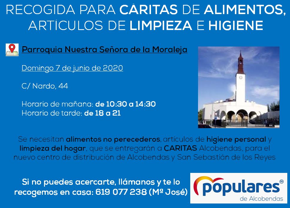 El Partido Popular de Alcobendas ha organizado una recogida de alimentos no perecederos, artículos de higiene personal y de limpieza del hogar para el próximo domingo 7 de junio a las puertas de la Parroquia Nuestra Señora de la Moraleja ,en la calle Nardo número 44, de 10:30 a 14:30 y de 18 a 21 horas.