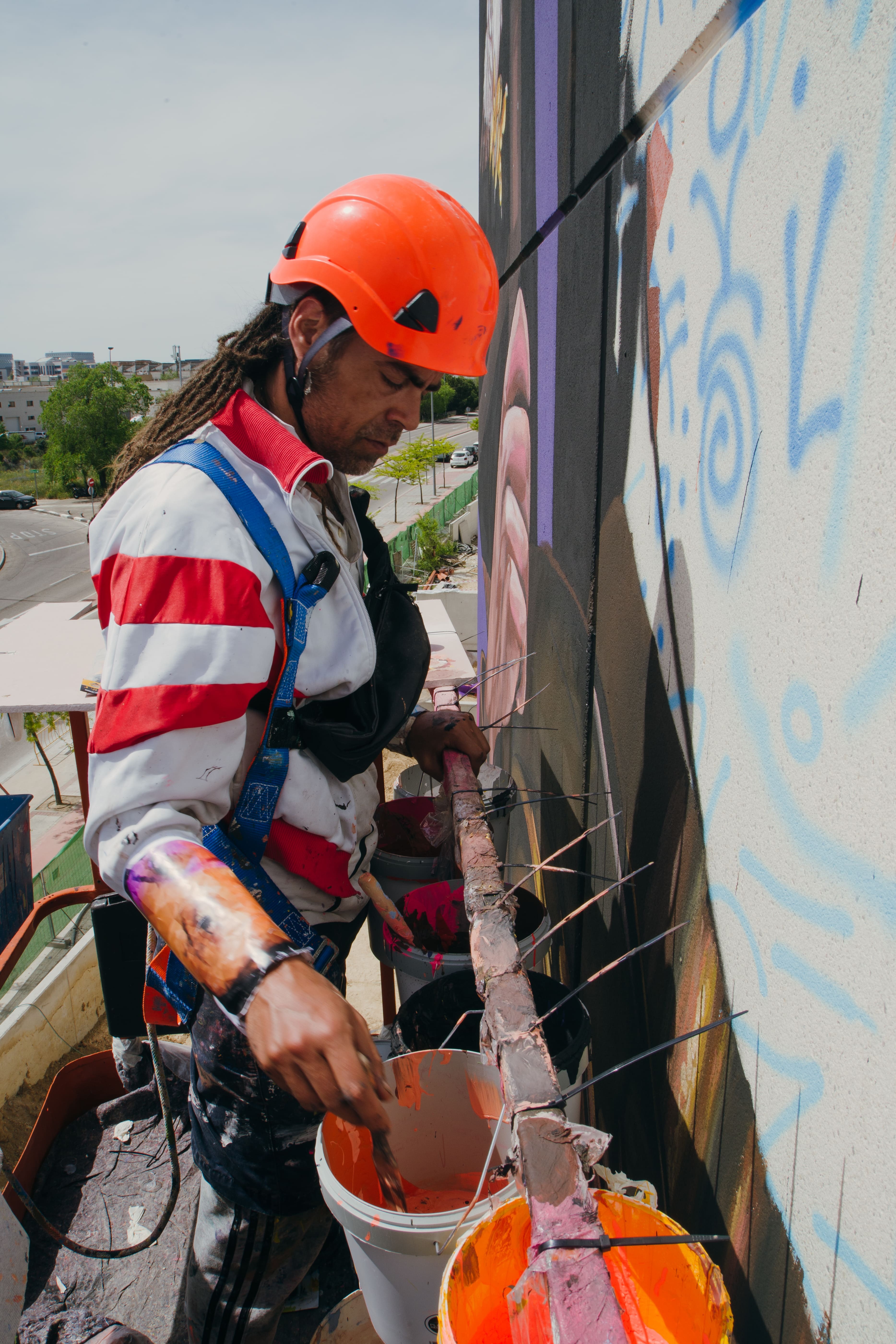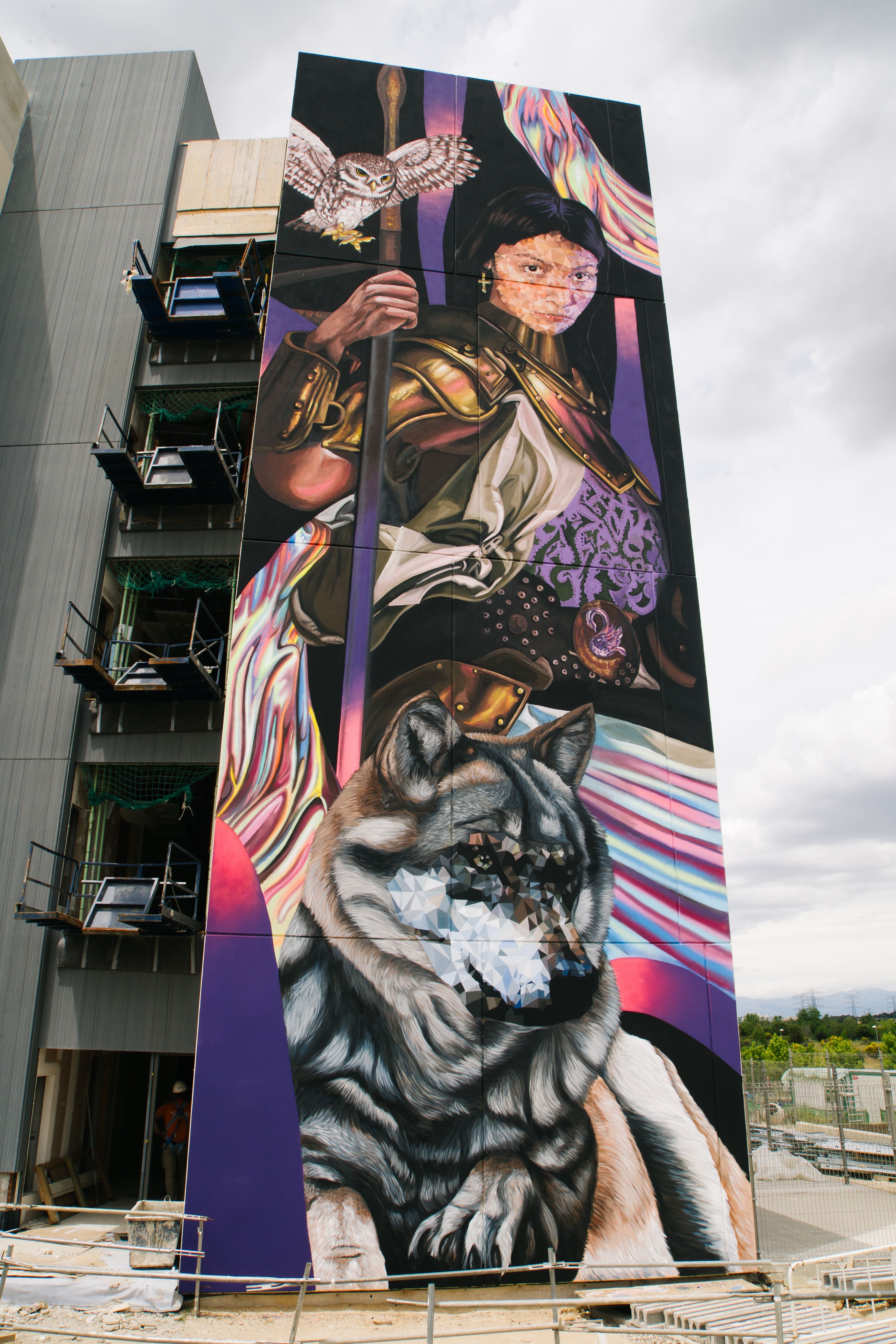 La construcción del proyecto Livensa Living Studios Madrid Alcobendas culmina con la intervención mural de más de 138 metros cuadrados del artista Uriginal que ha representado un personaje femenino, fusión entre Atenea, diosa griega de la guerra y la civilización, y Minerva, diosa romana de la sabiduría y las artes; una mujer cuyo rostro parece un mosaico realizado con una miríada de tonos. Y es que el artista ha dejado su impronta en esta obra, caracterizada por la deconstrucción de lo orgánico para reinterpretarlo visualmente a través de composiciones geométricas que juegan con los volúmenes y las sombras.