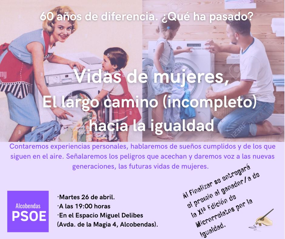 Hoy, martes 26 de abril, el PSOE de Alcobendas va a celebrar un encuentro intergeneracional de mujeres para debatir sobre el futuro de la igualdad. Una veterana y una joven se sentarán frente a frente, moderadas por la secretaria de Igualdad del PSOE de Alcobendas, Cristina Martínez Concejo, e intercambiarán experiencias vitales y expectativas. Se celebrará en el Espacio Delibes (Avda. de la Magia 4, Alcobendas). De este modo también se entregaran los premios de la IX edición de Microrelatos por la igualdad, convocados en el mes de marzo.