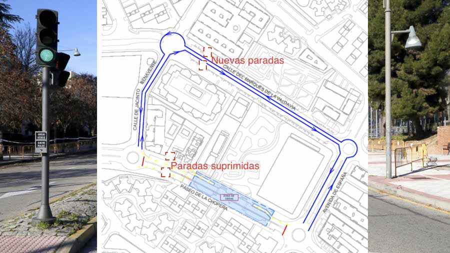 Las obras supondrán el desvío de las líneas de autobús 157, N-101, C10 y L2, que se han desviado desde el pasado lunes por Jacinto Benavente, Marqués de la Valdavia y Avenida de España. Las paradas situadas junto al Centro de Salud Valdavia en el Paseo de la Chopera se han suprimido y trasladado a la calle Marqués de la Valdavia, junto a la glorieta con Ruperto Chapí y Jacinto Benavente.