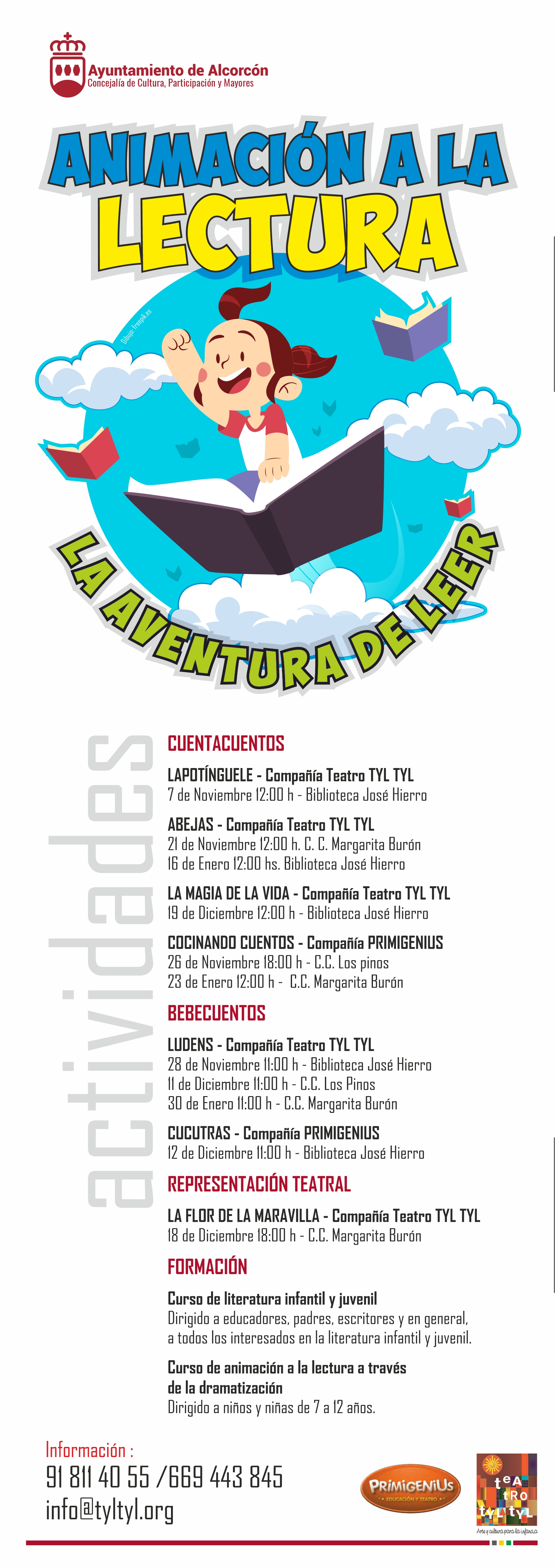- Curso de animación lectora a través de la dramatización. Miércoles de 17:30h a 19:30h. Dirigido a niños y niñas de 7 a 12 años. Gratuito.