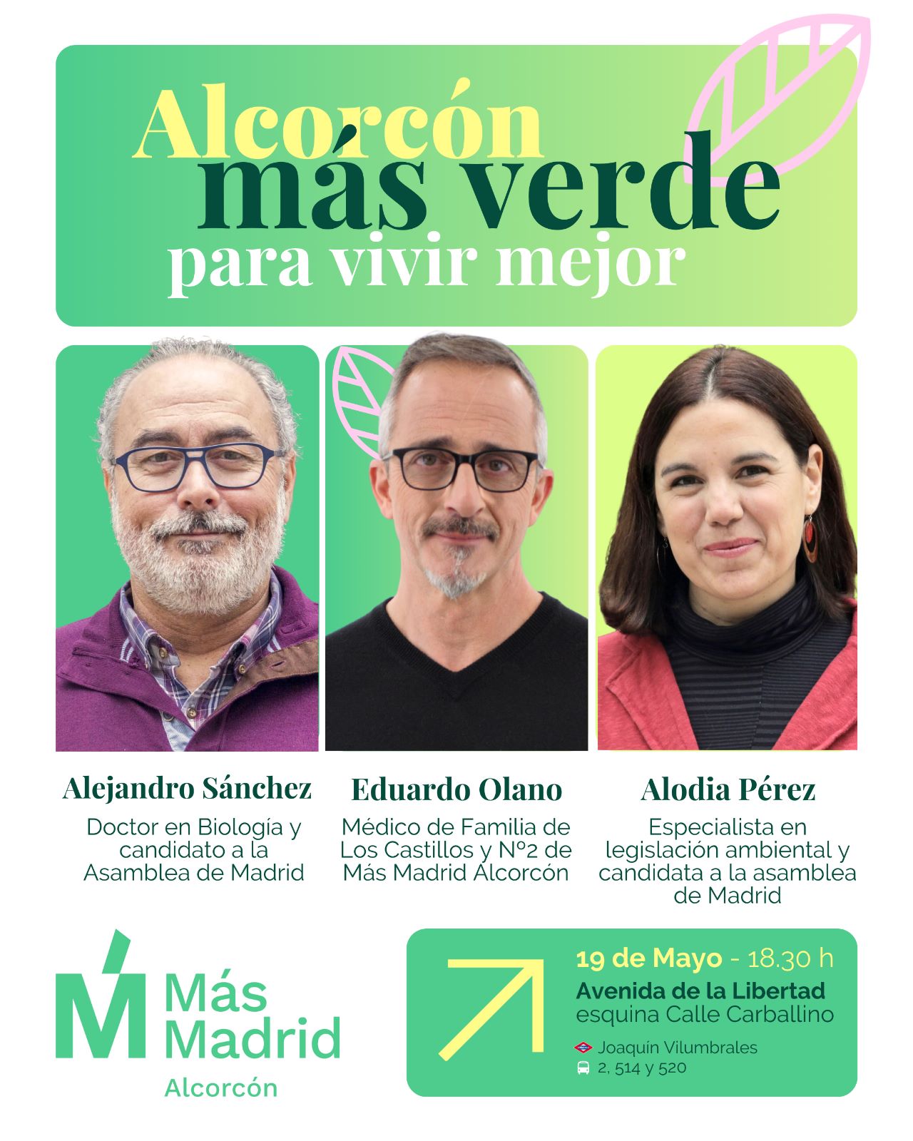 Este viernes a las 18:30h, en la Avenida de la Libertad esquina con Calle Carballino, la formación verde presentará sus puntos programáticos sobre renaturalización y conservación de los espacios verdes del municipio. El acto estará presentado por el número dos de la lista y médico de Atención Primaria del centro de salud Los Castillos, Eduardo Olano, y le acompañarán los candidatos a la Asamblea de Madrid, Alejandro Sánchez, doctor en Biología y fundador de EQUO, y Alodia Pérez, especialista en legislación ambiental.