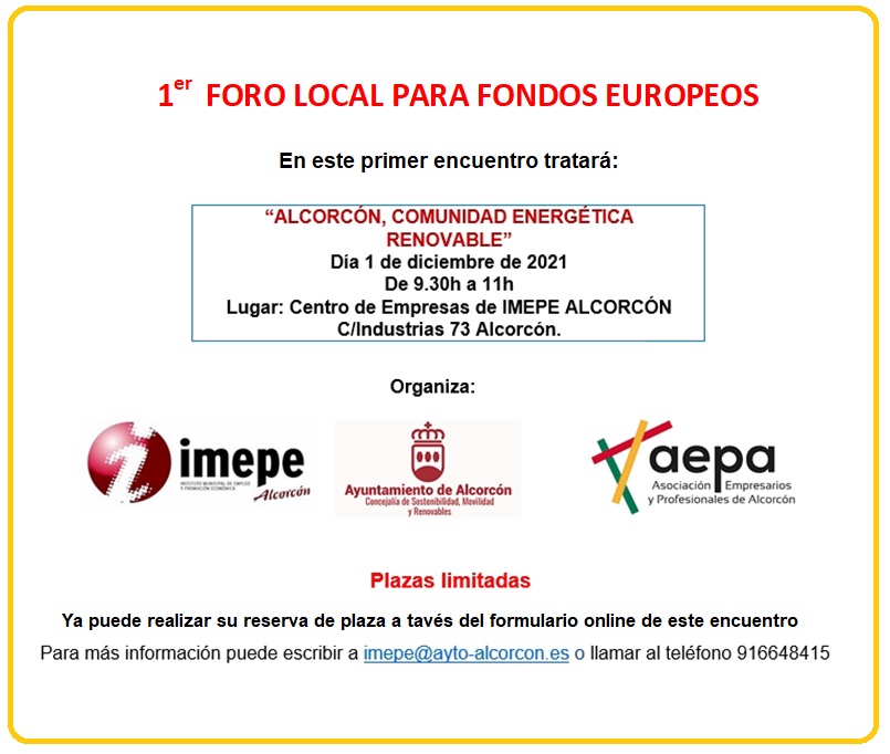 La organización del foro ha contado con la colaboración entre el Instituto Municipal de Empleo (IMEPE), la concejalía de Sostenibilidad, Movilidad y Renovables de Alcorcón y AEPA. Se celebrará el próximo 1 de diciembre a las 9:30H en el Centro de Empresas (C/ Industrias, 73) del IMEPE. Quien quiera asistir puede hacerlo inscribiéndose en este formulario.