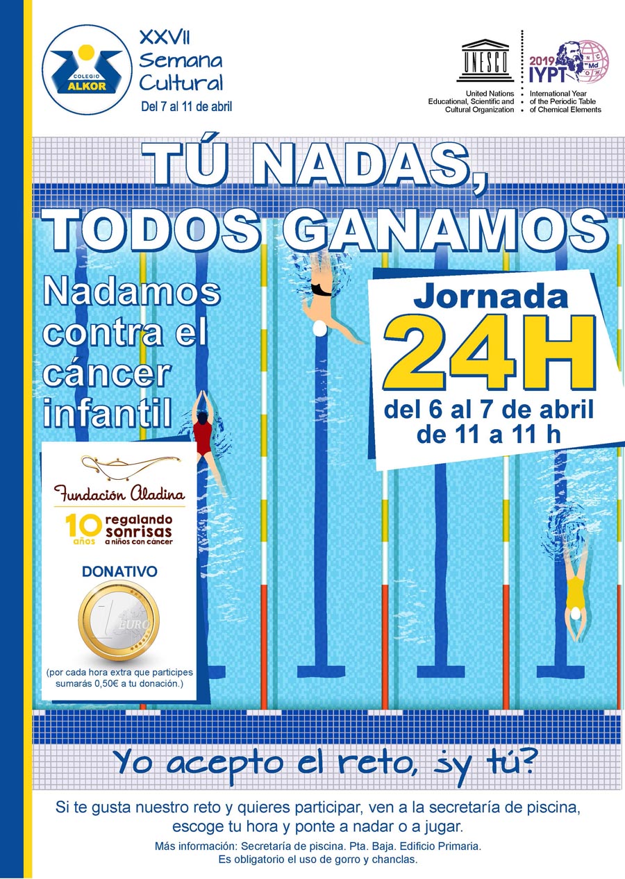 La piscina del Colegio Alkor organiza una jornada de 24 horas nadando a beneficio de la Fundación Aladina. Se trata de un maratón de natación que comienza el día 6 de abril a las 11 h. y que se prolonga hasta el día siguiente, 7 de abril, a las 11 h. Una iniciativa que se enmarca en la celebración de la XXVII Semana Cultural del colegio.