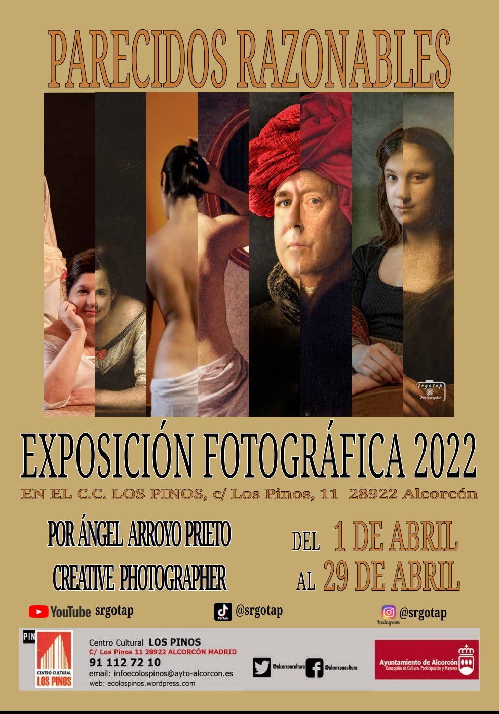 El fotógrafo Ángel Prieto presenta su colección "Parecidos Razonables" en el C. C. Los Pinos (C/Los Pinos, 11) hasta el próximo 29 de abril. Se trata de una colección de 34 fotografías basadas en cuadros clásicos e impresas en lienzo a gran tamaño, interpretadas con humor, en un proyecto que surgió con la imposibilidad de salir al exterior a realizar fotografías durante la pandemia. La muestra se podrá visitar en horario de 9 a 21 horas de lunes a viernes. Los sábados y domingos, permanecerá abierta de 9 a 14.30 horas.
