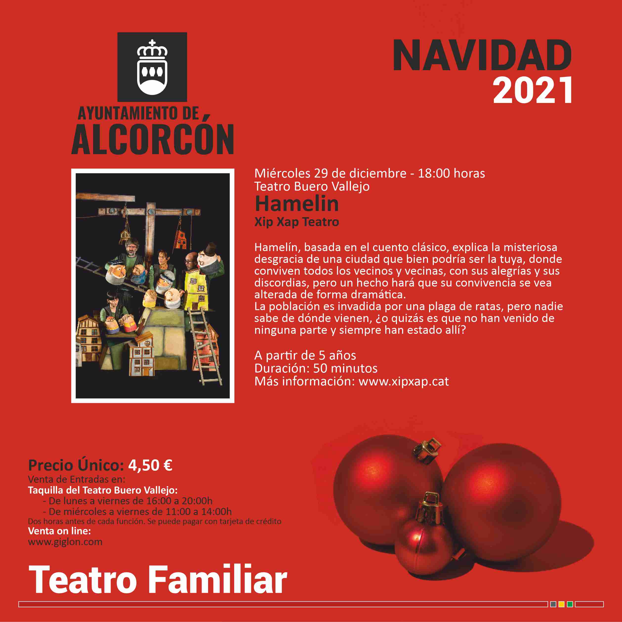 La última de las funciones del teatro Buero Vallejo es ‘Hamelin’, la adaptación del cuento clásico ‘El flautista de Hamelin’, por la compañía Xip Xap, que ha obtenido el premio dragón de Oro en la 32ª Feria de Teatro de Títeres de Lleida (2021). ‘Hamelín’ explica la misteriosa desgracia de una ciudad que verá alterada su convivencia de forma dramática. La población es invadida por una plaga de ratas, pero nadie sabe de dónde vienen, ¿o quizás es que no han venido de ninguna parte y siempre han estado allí?.