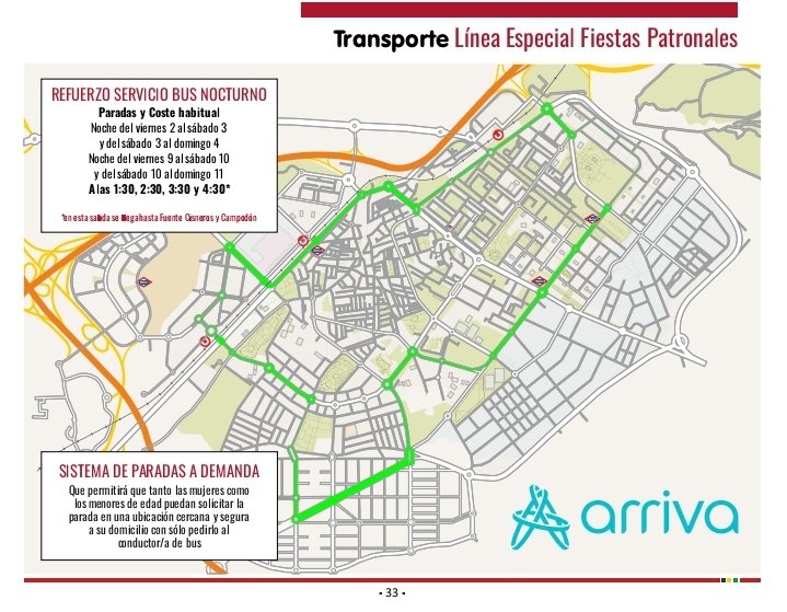 Un año más, y con el objetivo de facilitar la llegada, acceso y regreso a casa desde el Recinto Ferial, se ha habilitado un refuerzo en el servicio nocturno de autobuses, con ampliación de horarios a la 1.30, 2.30, 3.30 y 4.30 en la madrugada del viernes 2 al sábado 3, del sábado 3 al domingo 4, del viernes 9 al sábado 10 y del sábado 10 al domingo 11, con el coste y paradas habituales. La última salida amplía el recorrido y llega hasta Fuente Cisneros y Campodón. De nuevo se pone también a disposición de mujeres y menores la alternativa de paradas a demanda, con el fin de poder bajarse del medio de transporte en una ubicación cercana al domicilio con solo pedirlo al conductor.