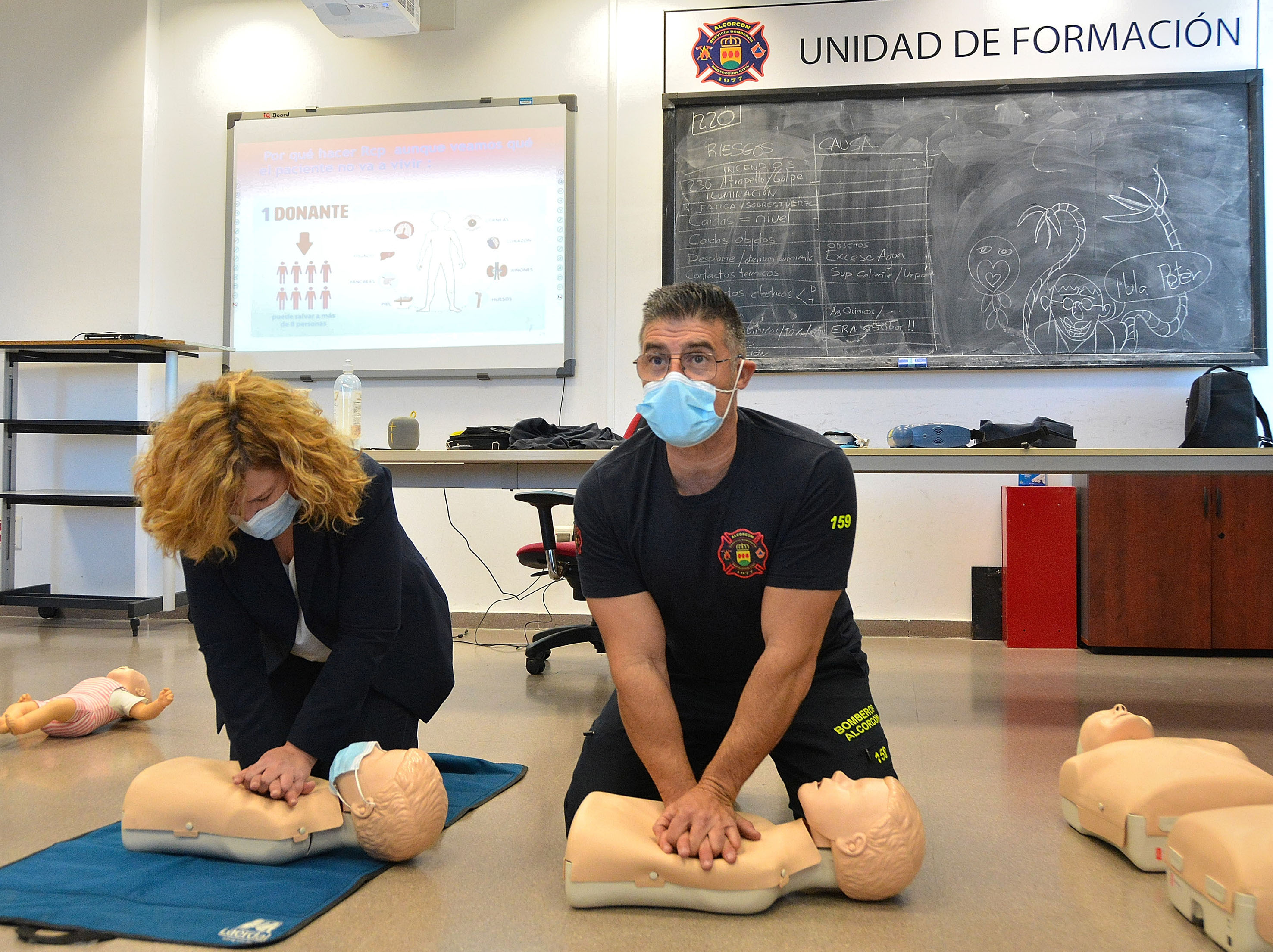 De este modo, la alcaldesa de nuestra ciudad ha acudido esta mañana, junto a otros empleados municipales a este curso de 5 horas de duración y recibir la formación que abarca materias como la formación en primeros auxilios y soporte vital básico con un contenido práctico de reanimación cardiopulmonar y puesta en práctica en el manejo de extintores y bocas de incendio equipadas.