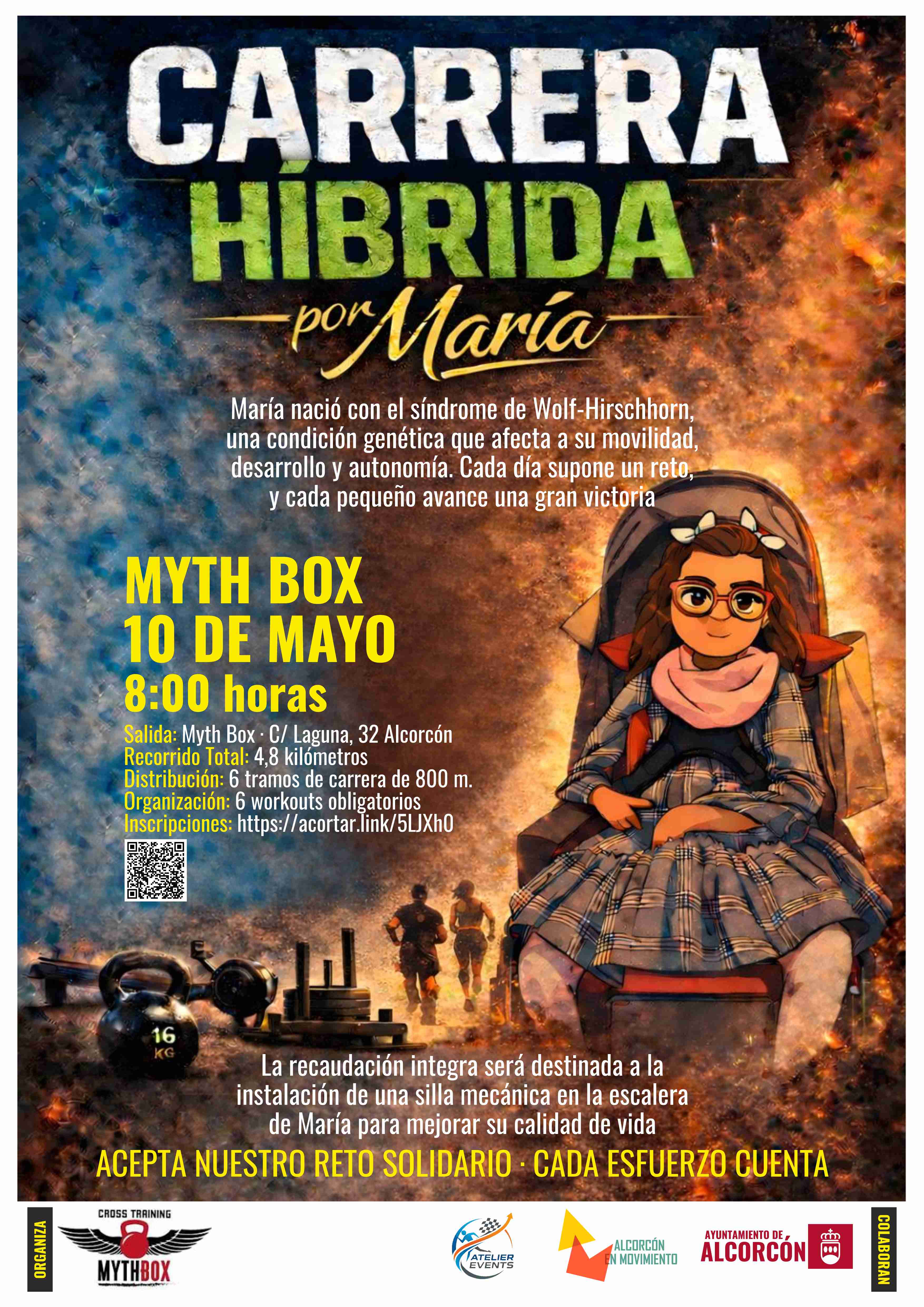 Alcorcón acogerá el domingo 10 de mayo la ‘Carrera Híbrida por María’, un evento organizado por el centro deportivo Mythbox en colaboración con la Concejalía de Deportes, que tiene el objetivo de recaudar fondos para María, que padece el síndrome de Wolf-Hirschhorn (SWH), una condición genética que afecta a su movilidad, desarrollo y autonomía.