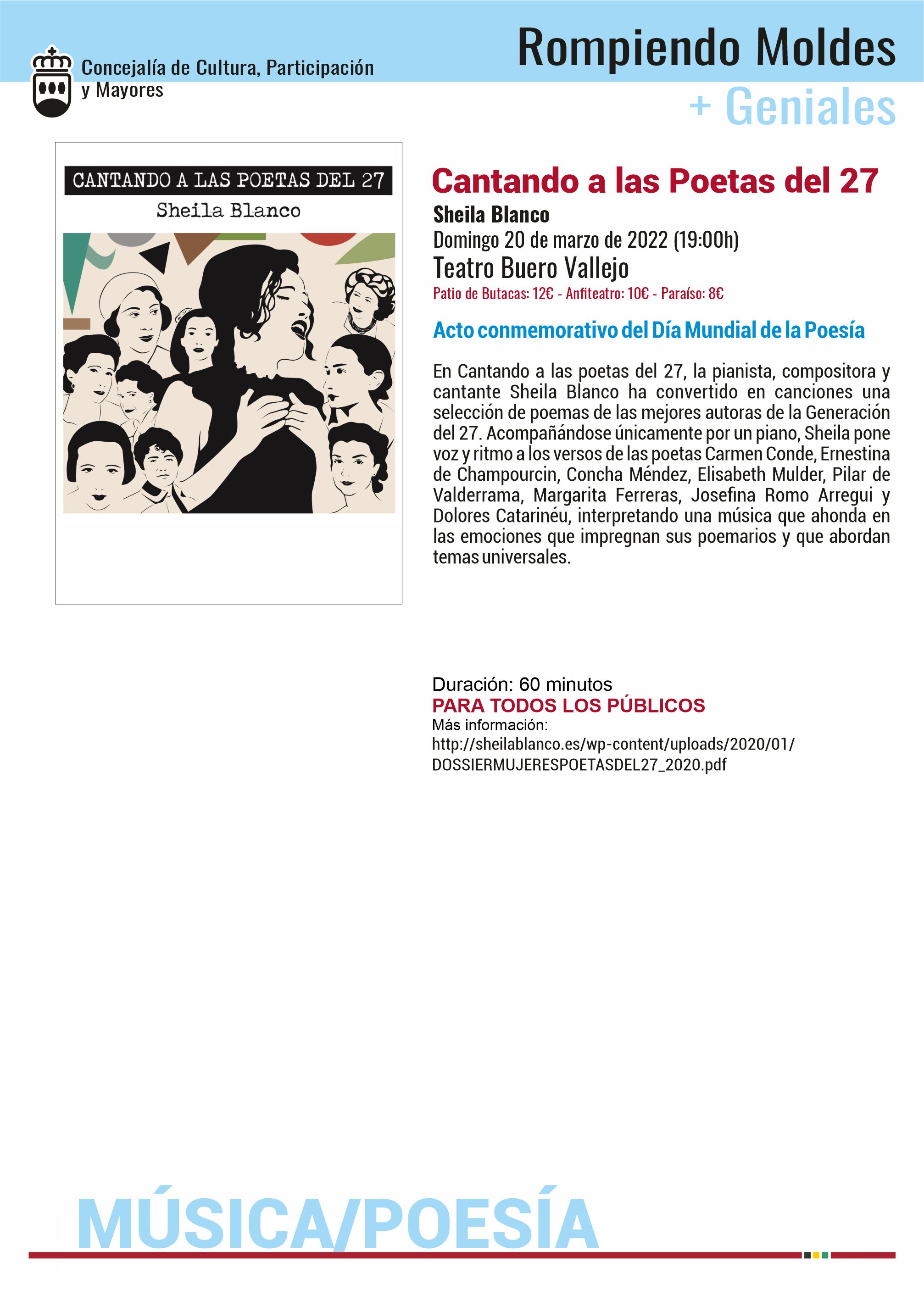 “Hemos querido celebrar la poesía disfrutando de la obra de las grandes poetas de la Generación del 27, en la maravillosa voz y singular interpretación de Sheila Blanco”, ha destacado Sonia Lopez, concejala de Cultura, Participación y Mayores, señalando que “el público tiene derecho a conocer y disfrutar su estupendo legado literario, y el momento y la artista encargada de hacerlo, no pueden ser más idóneos”.