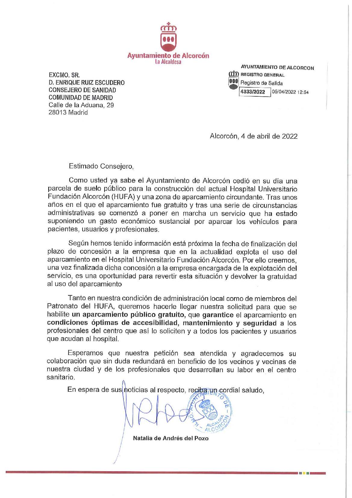 El Ayuntamiento de Alcorcón ha solicitado, a través de una carta firmada por la alcaldesa, Natalia de Andrés, al consejero de Sanidad de la Comunidad de Madrid, Enrique Ruiz Escudero, que el aparcamiento del Hospital Universitario Fundación Alcorcón sea público y gratuito una vez finalice la concesión actual otorgada a una empresa privada.