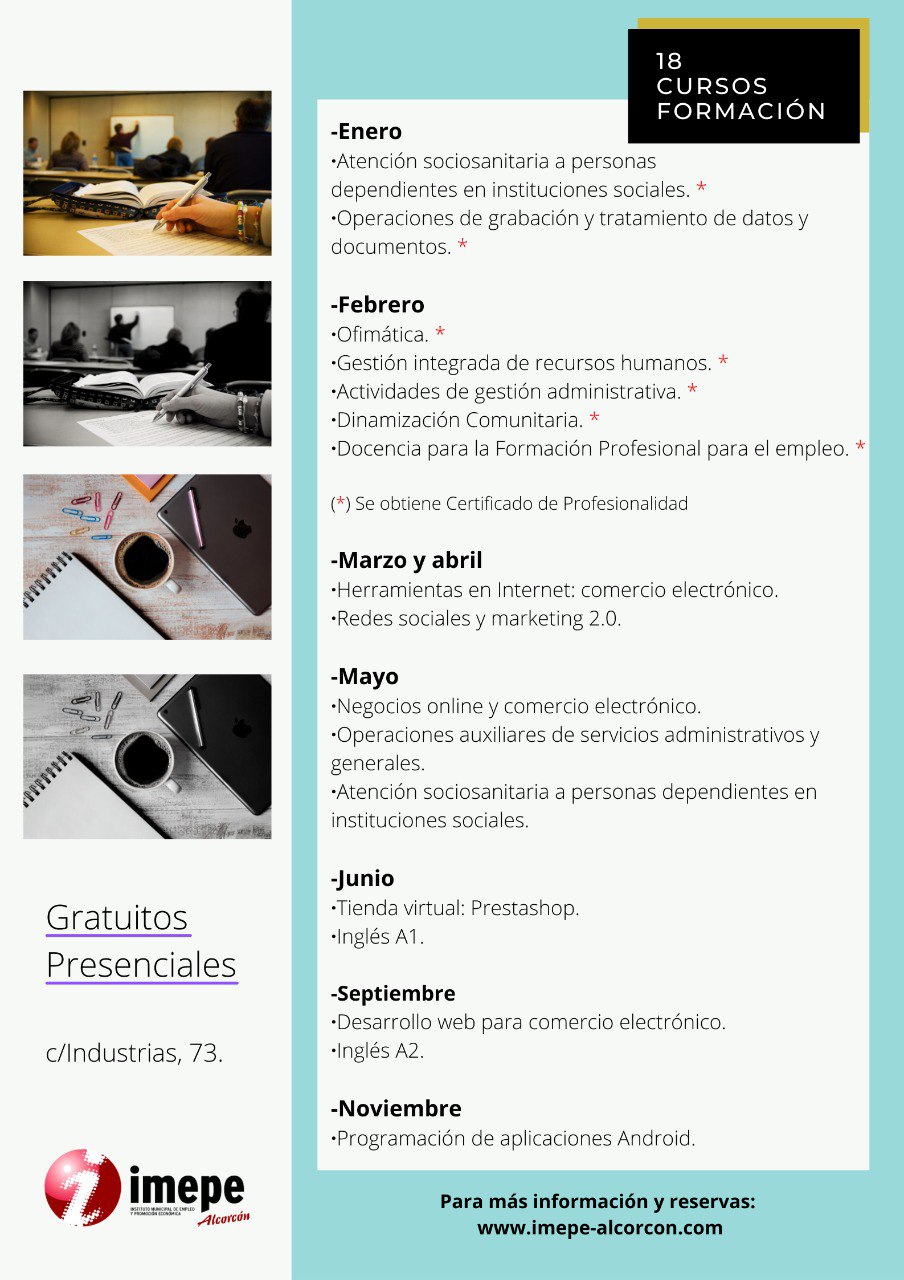 Se trata de una oferta de formación con la que el IMEPE da un paso definitivo hacia un nuevo modelo, apostando por la digitalización del tejido productivo de la ciudad de Alcorcón. A lo largo de 2022, está prevista la realización de un total de 18 cursos formativos, 7 de los cuales permitirán la obtención del Certificado de Profesionalidad. Entre ellos se encuentran los de Atención sociosanitaria a personas dependientes en instituciones sociales, del que se han programado dos ediciones, una en horario de mañana y otra en horario de tarde, así como sobre Operaciones de grabación y tratamiento de datos y documentos. Estos tres cursos, en concreto, ya han dado comienzo durante el mes de enero y se encuentran actualmente en marcha.