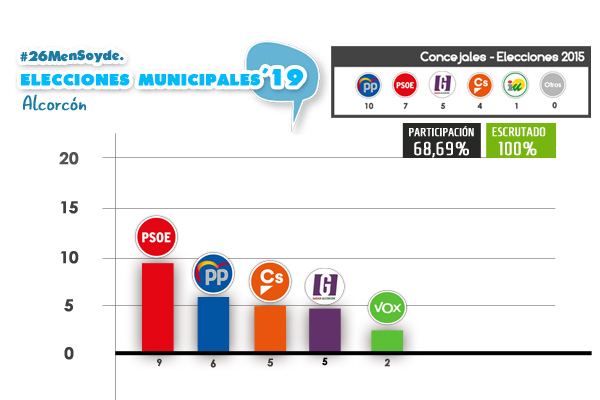 Los 9 concejales socialistas están seguidos por los 6 del PP, los 5 de Ciudadanos, los otros 5 de Ganar Alcorcón y los 2 de VOX.