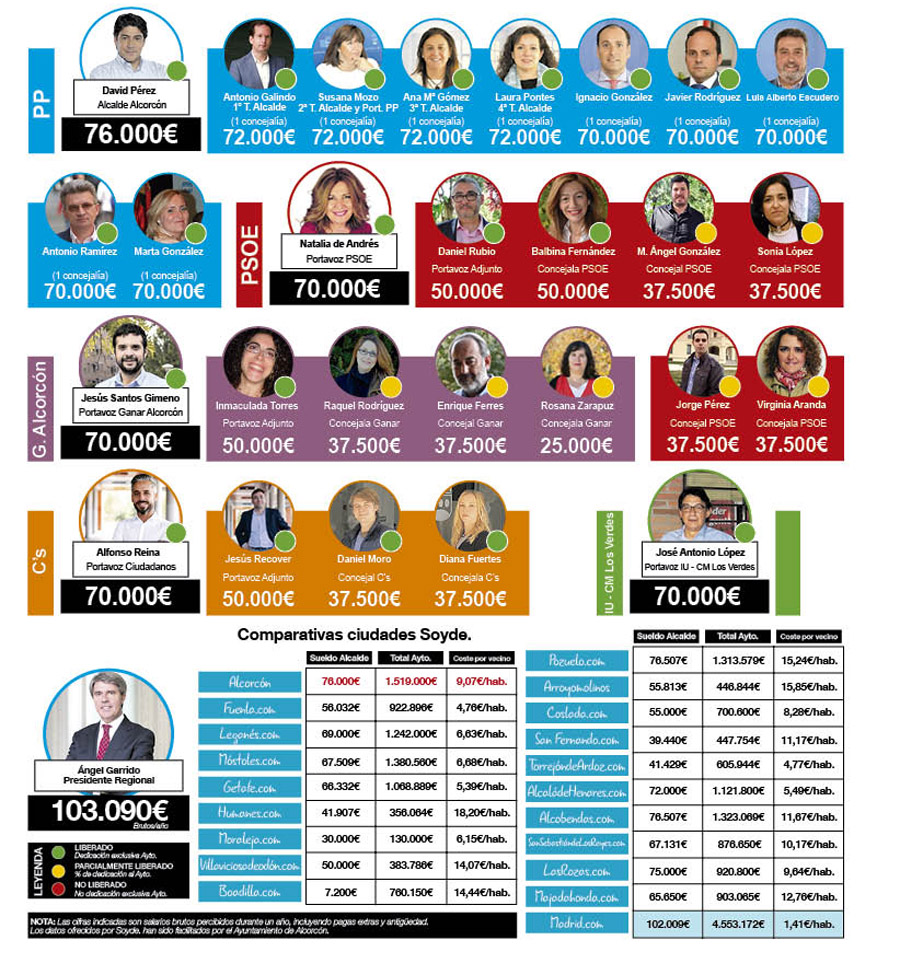SoydeAlcorcon.com, de nuevo, ha querido trasladar en este reportaje el salario mensual de todos los concejales que conforman la Corporación municipal de Alcorcón y el gasto total que supone para las arcas del consistorio el pago de sus retribuciones y lo que pagamos cada ciudadano al año por que dirijan y gestionen nuestra ciudad.