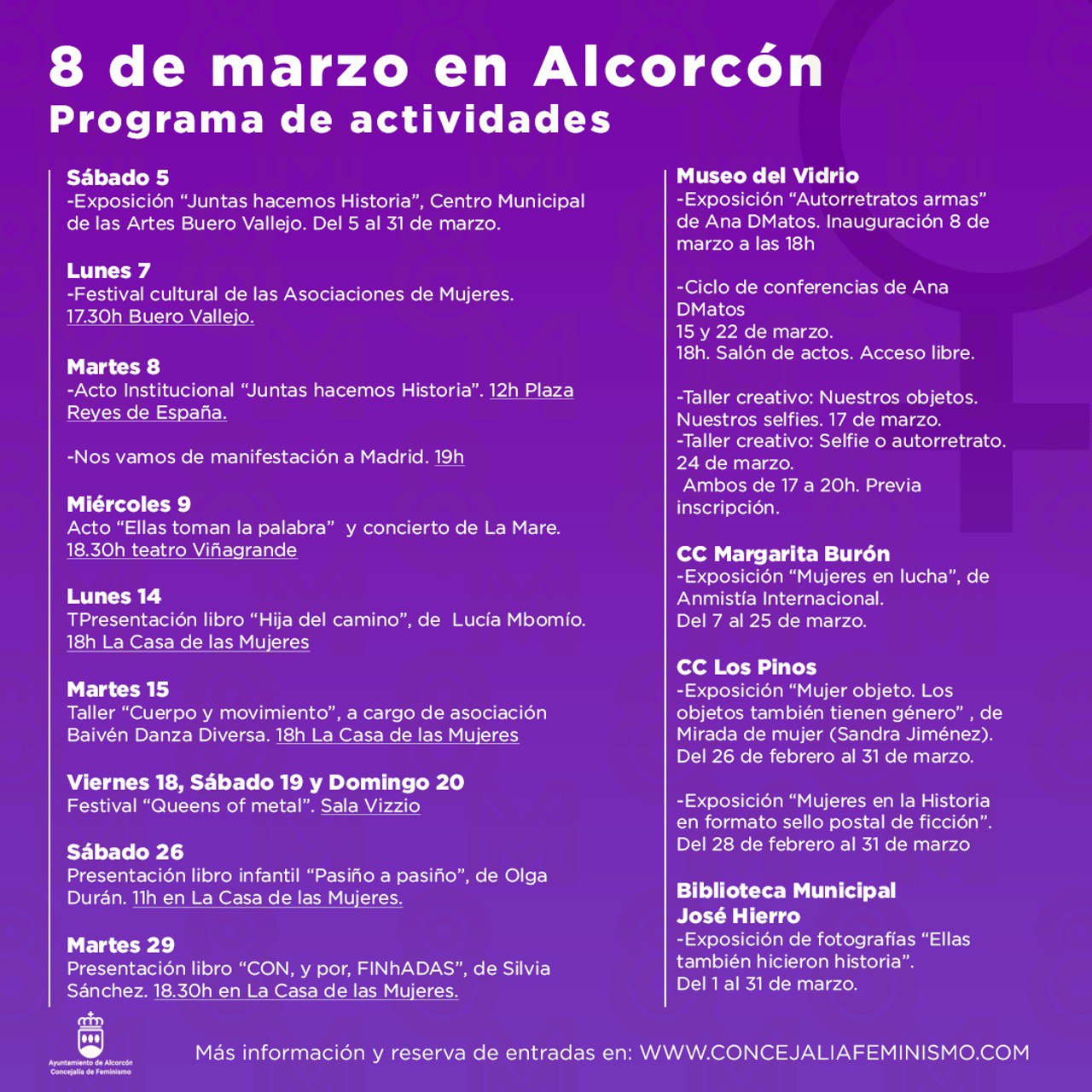 Además, se ha preparado un programa de actividades que se extenderá durante todo el mes de marzo y que incluye charlas, talleres y el concierto de La Mare. Este año, por primera vez, se realizará la entrega de premios “Juntas hacemos Historia”, que reconocerá el trabajo por la igualdad en Alcorcón a cinco vecinas y entidades sociales, y que se llevará a cabo durante el acto institucional del 8 de marzo.