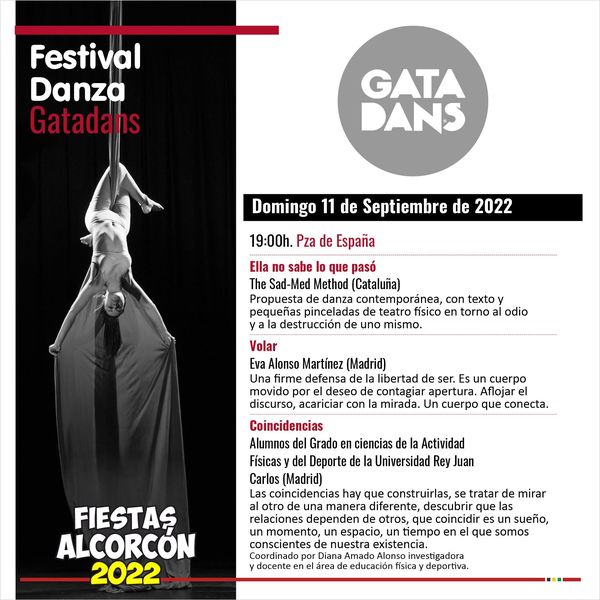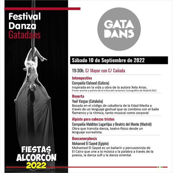Alcorcón se viste de fiesta, y una parte importante de la programación tiene que ver con la cultura, y en particular, con la danza. Es por ello que la calle servirá de escenario natural para Gatadans, un festival de danza itinerante que recorrerá el entorno de la calle Mayor durante los días 10 y 11 de septiembre, en los que varias compañías ofrecerán al público asistente siete piezas diferentes. A las 19.30 comenzará el espectáculo de la mano de la compañía gallega Elahood, con 'Intempestiva', inspirada en la vida y obra de la autora Xela Arias, y primer premio y premio de la crítica del Certamen Coreográfico de Madrid 2021. A continuación será el turno de 'Reyerta', de Yoel Vargas, basada en el código de caballería de la EDad Media a través de un lenguaje gestual que se combina con el baile flamenco y la rítmica musical y corporal.