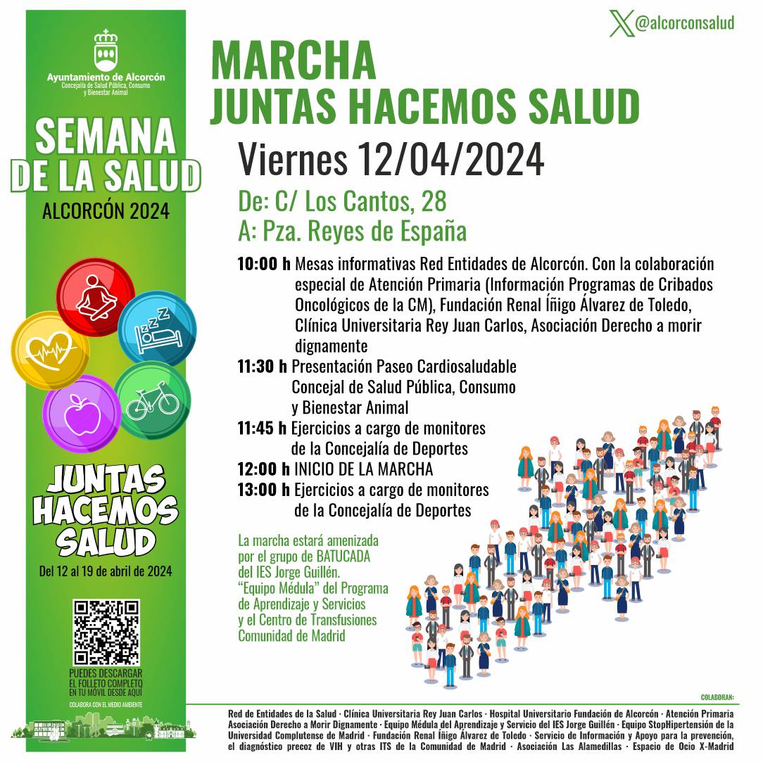 La inauguración tendrá lugar el viernes 12 de abril, comenzando por la instalación de mesas informativas de la Red de Entidades de Alcorcón en la calle Los Cantos (frente al polideportivo municipal) para, posteriormente, presentar los ‘Paseos Cardiosaludables’ de la Concejalía de Salud Pública, Consumo y Bienestar Animal. A las 12 horas comenzará la Marcha, que partirá desde este espacio hasta la Plaza Reyes de España, y que estará amenizada por el grupo ‘Batucada’ del IES Jorge Guillén.