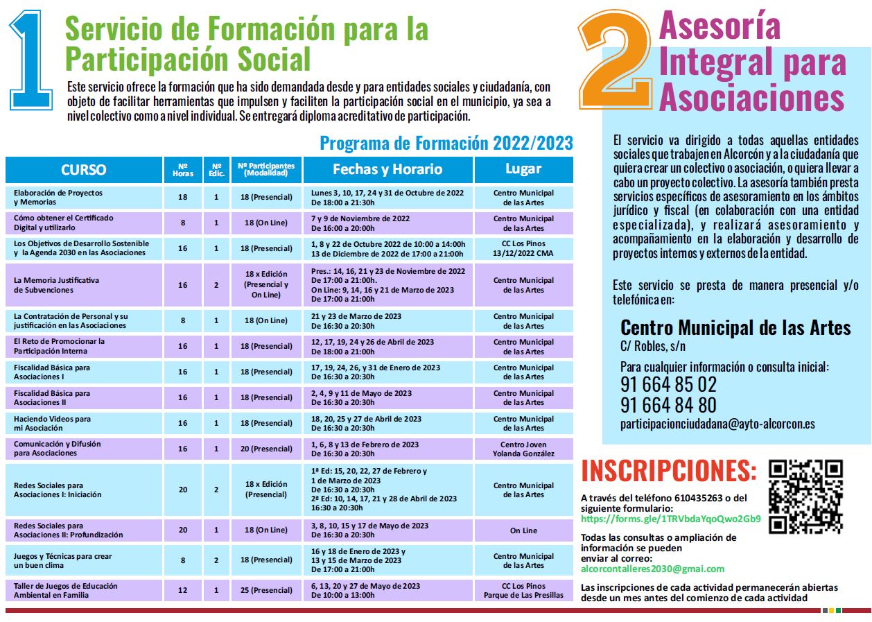 Paralelamente se ha estado trabajando en la elaboración de un Plan Municipal de Participación Ciudadana, habiendo recogido propuestas durante todo el proceso, que sigue abierto en la actualidad a través de una web específica que acompaña todo el proyecto. Las inscripciones para los cursos ‘Elaboración de Proyectos y Memorias’ y ‘Los objetivos de Desarrollo Sostenible y la Agenda 2030 en las Asociaciones’ ya están abiertas, con información en nuestra web y a través del teléfono 610435263, o en el correo alcorcontalleres2030@gmail.com. El servicio de Asesoría Integral para Asociaciones comenzará en octubre, aunque ya se pueden hacer las consultas iniciales a través del 916648502.