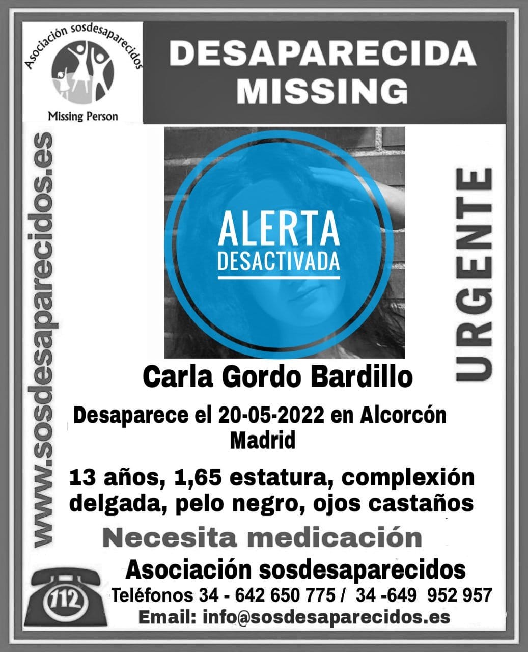Carla Gordo, la menor de 13 años de Alcorcón que desapareció el 20 de mayo, ha sido localizada. La asociación SOS Desaparecidos se hacía eco de la información para encontrar a la joven, buscada por su familia, entorno y las Fuerzas y Cuerpos de Seguridad, y quien, además, necesitaba medicación. Tras volver a casa, las informaciones apuntan a que se marchó voluntariamente y ya ha regresado por su propio pie.