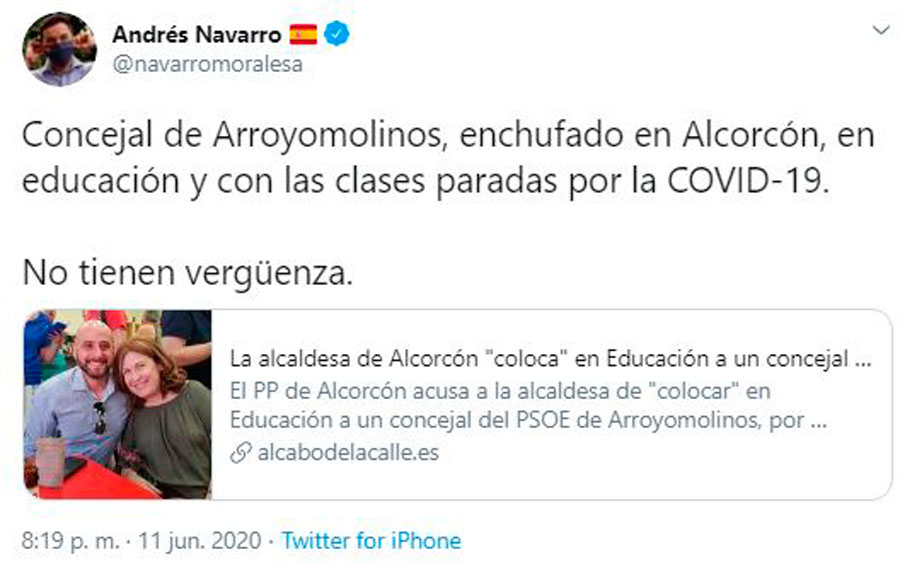 En la misma línea se ha pronunciado el portavoz del PP arroyomolinense, Andrés Navarro, en su cuenta de Twitter. “Concejal de Arroyomolinos, enchufado en Alcorcón, en educación y con las clases paradas por la COVID-19. No tienen vergüenza”. Pese a las críticas, Jiménez no cuenta con dedicación exclusiva en la Corporación de Arroyomolinos, por lo que su nuevo cargo en Alcorcón no incurre en una incompatibilidad.