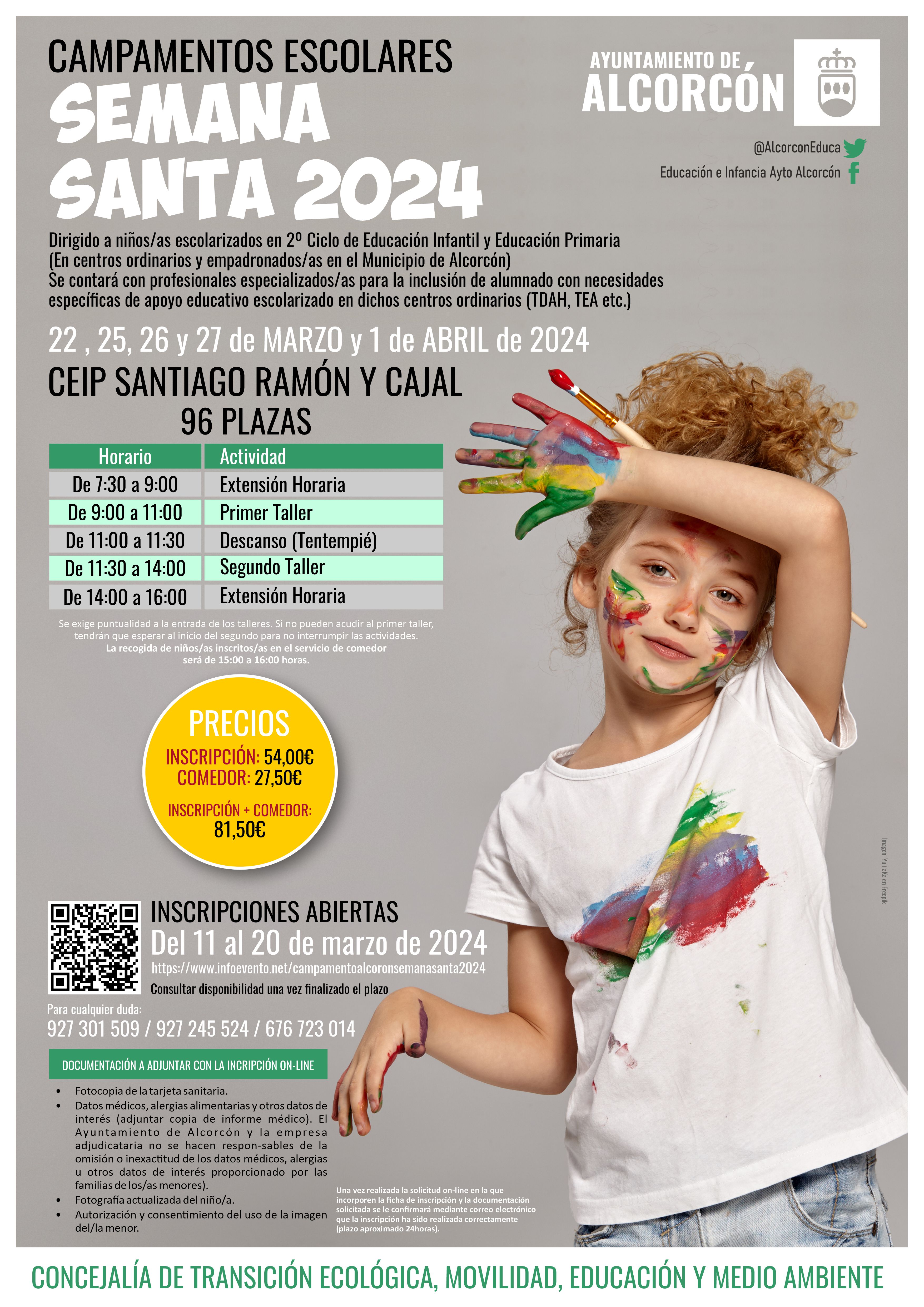 Dirigido a niños/as escolarizados en 2o ciclo de Educación Infantil y Educación Primaria (en centros ordinarios y empadronados/as en Alcorcón), se desarrollarán los días 22,25,26,27 de marzo, así como el 1 de abril de 2024. Tendrán lugar en el CEIP Ramón y Cajal en horario de 7.30 a 16 horas (incluido comedor, siendo la recogida de niños/as de 15 a 16h).
