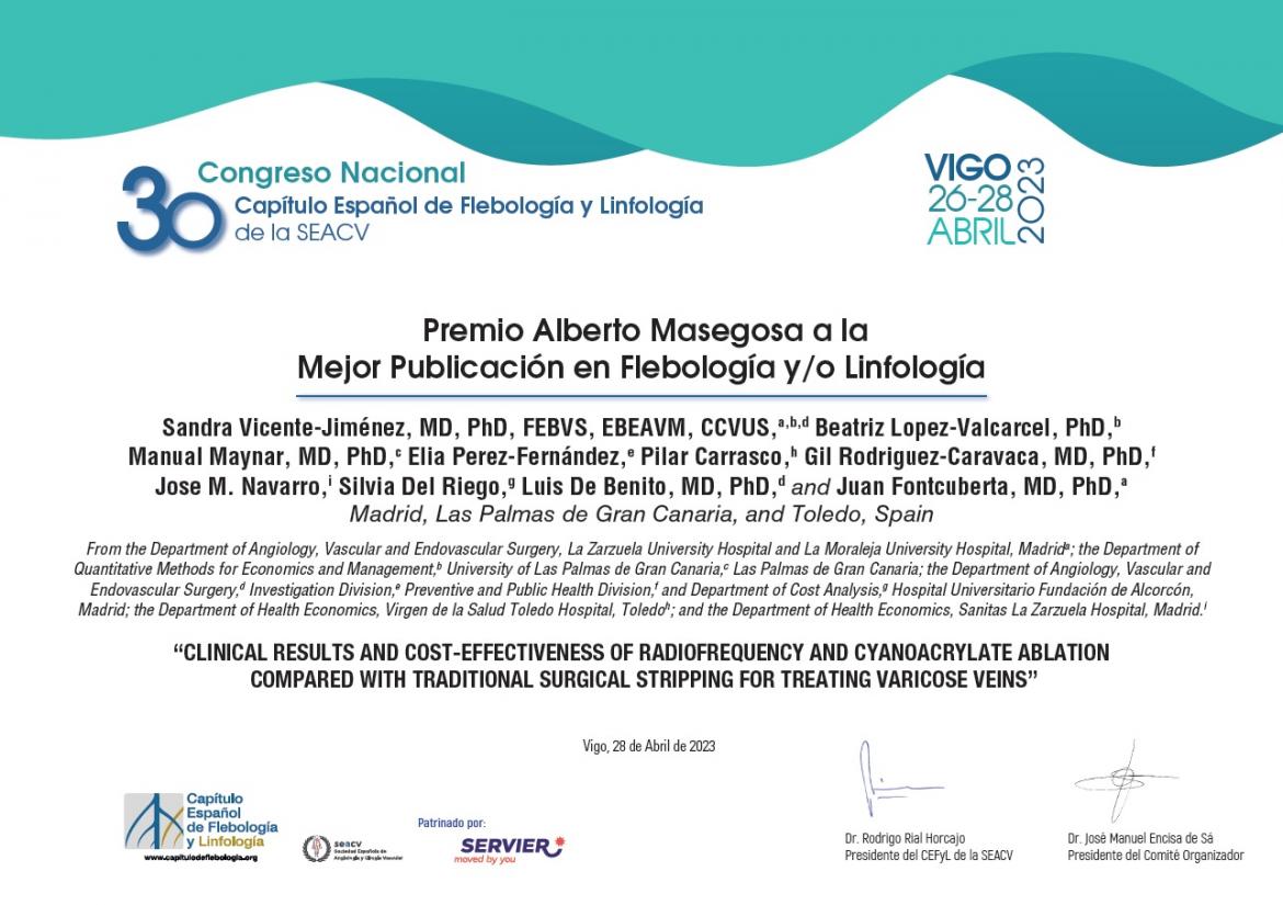 Una publicación científica firmada por cinco profesionales del Hospital Universitario Fundación Alcorcón, de forma conjunta con otros investigadores, ha sido premiada con el galardón el Premio Alberto Masegosa a la Mejor Publicación en Flebología y/o Linfología en el XXX Congreso Nacional de la Sociedad de Angiología. Bajo el título Resultados clínicos y rentabilidad de la ablación por radiofrecuencia y cianoacrilato frente a la extirpación de la vena safena para el tratamiento de varices”, ha sido difundido a través del medio Journal of Vascular Surgery: Venous and Lymphatic Disorders.