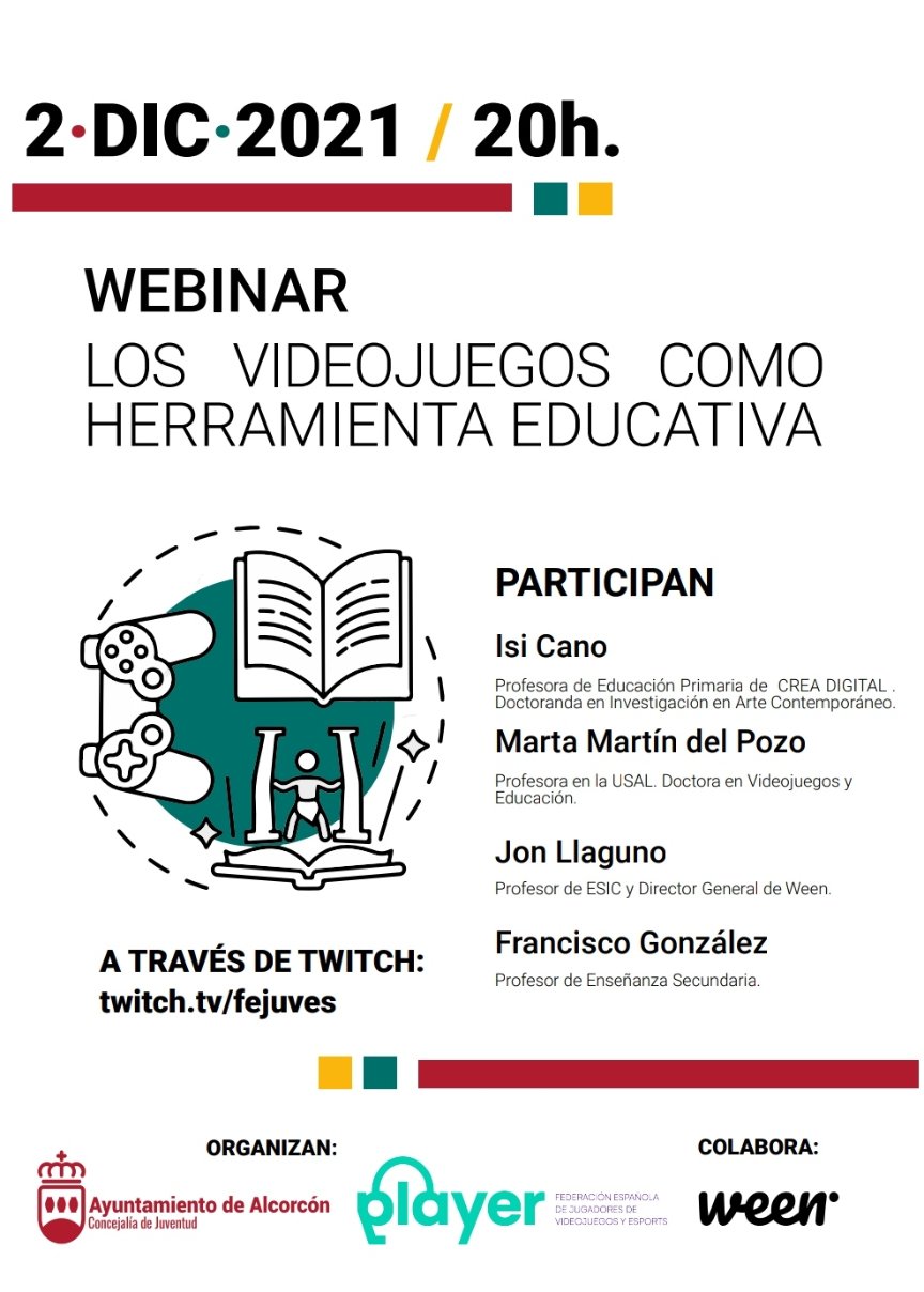 Se emitirá a través de la plataforma twitch en el canal de FEJUVES (twitch.tv/fejuves) el próximo jueves 2 de diciembre a las 20 horas y contará con la participación de Isi Cano (profesora de Educación Primaria de CREA Digital y Doctoranda en Investigación en Arte Contemporáneo), Marta Martín del Pozo (Profesora en la USAL, Doctora en Videojuegos y Educación), Jon Llaguno (Profesor de ESIC y Director General de Ween) y Francisco González (Profesor de Enseñanza Secundaria).