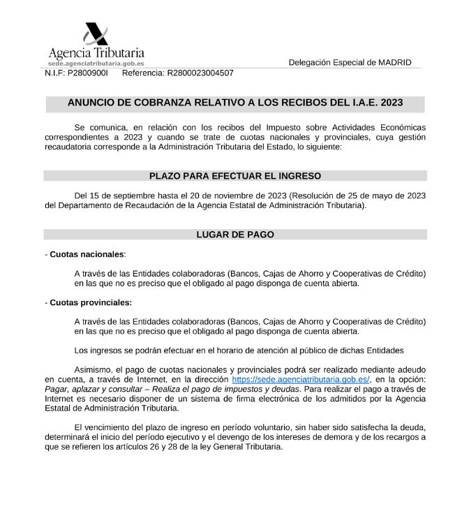 El plazo para efectuar el ingreso comienza el próximo 15 de septiembre y se extenderá hasta el 20 de noviembre, en base a la resolución de 25 de mayo de 2023 del Departamento de Recaudación de la Agencia Estatal de la Administración Pública.