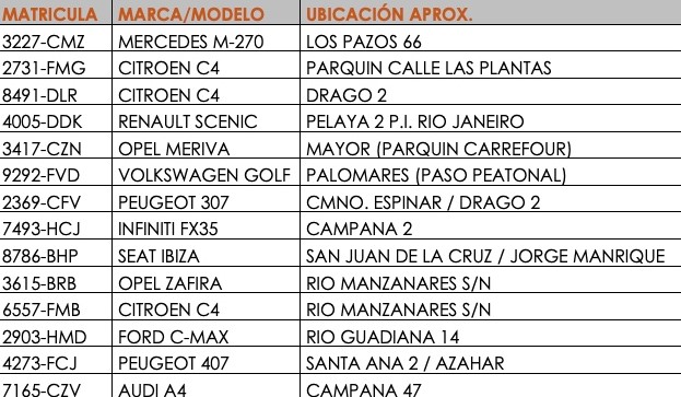 Es así como, de conformidad con lo dispuesto en el artículo 106 de la Ley de Seguridad Vial, aprobada por el R.D. 6/2015 de 30 de octubre, se hace un llamamiento público a los titulares de los siguientes vehículos con el fin de que procedan a su retirada, debido a su estado de abandono.