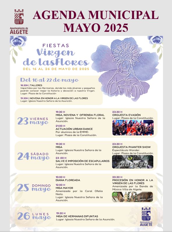 Algete celebrará del 16 al 26 de mayo sus tradicionales Fiestas en honor a la Virgen de las Flores. Durante los siete primeros días habrá talleres impartidos por las Hermanas, destinados a conocer mejor la historia y devoción hacia dicha imagen (a las 18.30), así como una Novena en su honor en la Iglesia Nuestra Señora de la Asunción (a las 19.30).