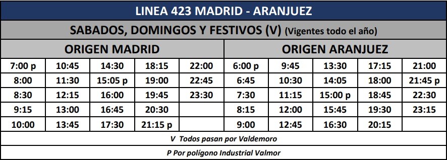 Los cambios indicados se harán efectivos el próximo sábado día 17 de septiembre. A partir de esa fecha, el horario para sábados, domingos y festivos de la línea 423 Madrid – Aranjuez – Madrid es el siguiente: