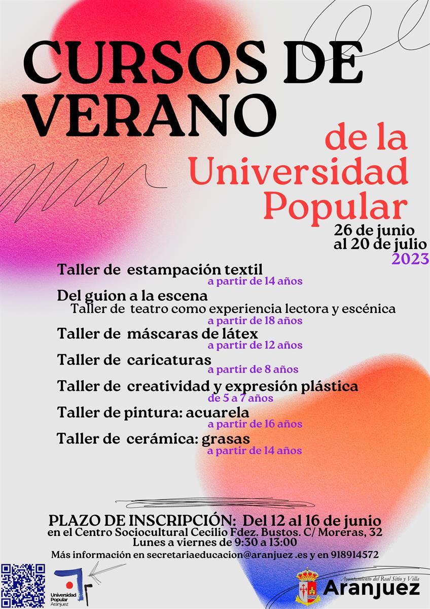 La Universidad Popular de Aranjuez apuesta con firmeza por el desarrollo de sus Cursos de Verano 2023. Con esta premisa, la institución anuncia que, del 26 de junio al 20 de julio, se podrá disfrutar de una gran multitud de talleres para todas las edades, que darán paso a jornadas repletas de diversión y aprendizaje.