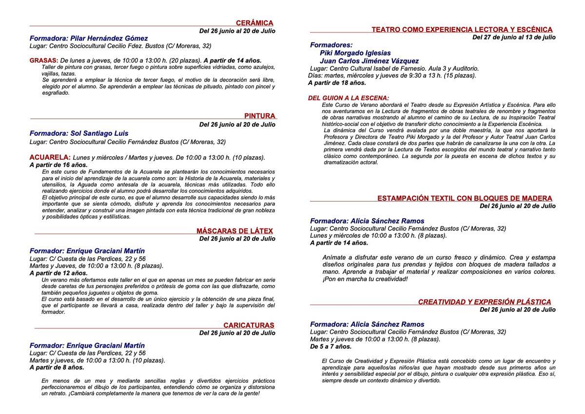 Asimismo, el plazo inscripción abarca un período del 12 al 16 de junio, pudiendo realizarse en el Centro Sociocultural Cecilio Fernández Bustos, calle Moreras, número 32, de 9:30 a 13:00 horas.