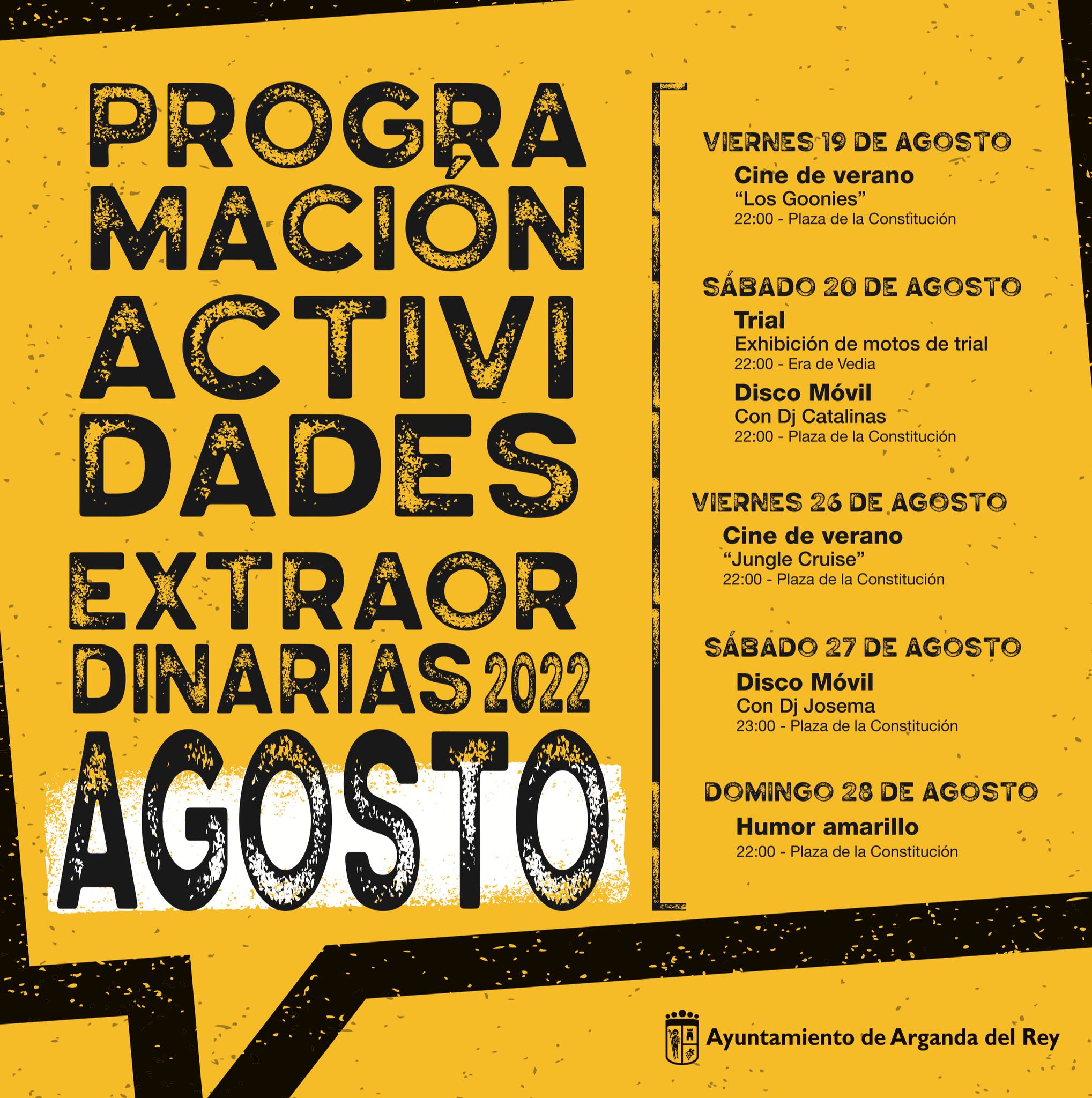 El Ayuntamiento de Arganda del Rey, a través de su Concejalía de Cultura, ha preparado una serie de actividades extraordinarias que se llevarán a cabo durante dos fines de semana consecutivos, los días 19 y 20, y 26, 27 y 28 de agosto.