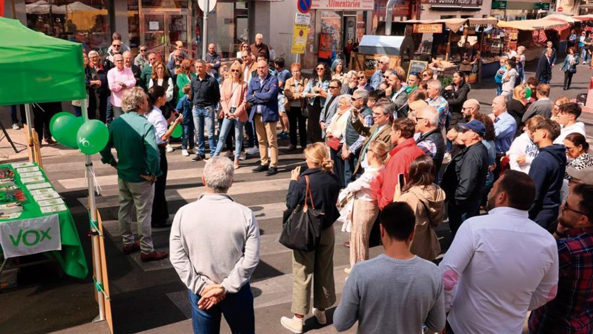 La candidata de VOX a la Presidencia de la Comunidad de Madrid y el candidato a la Alcaldía del municipio, Francisco de Paula Serrano, invitaron a los viandantes a café y palmeritas de chocolate en la Plaza de la Constitución