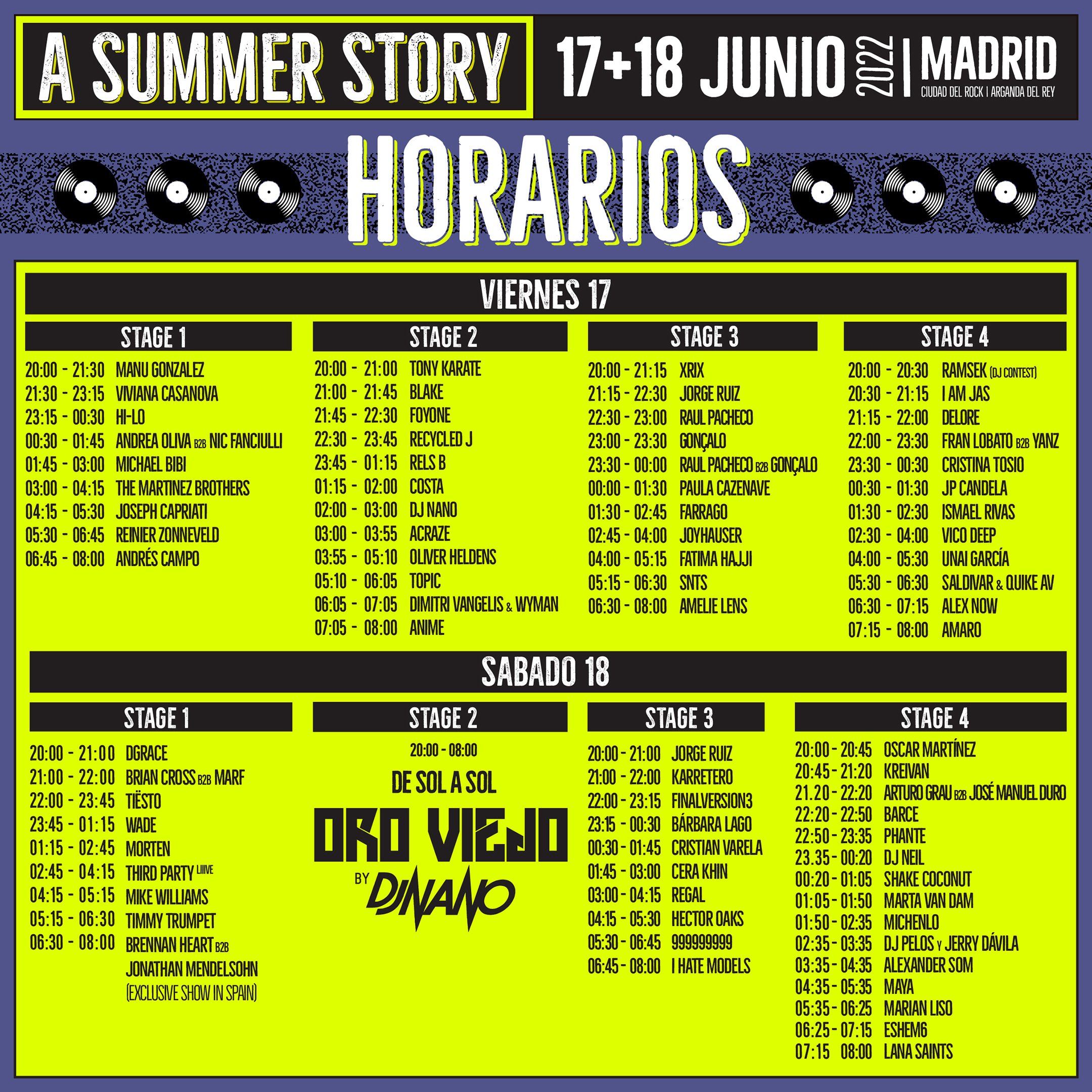 Para esta nueva edición del primer festival electrónico de verano, el cartel incluye artistas de la talla de DJ Nano, con su ya tradicional set “Oro Viejo” de doce horas que arrancará a las 20:00 horas del sábado, Tiësto, Oliver Heldens, Wade o Brian Cross, entre otros muchos. “A Summer Story” contará con zonas de restauración, zonas de sombra, fuentes de agua y mucho más, en un fin de semana para el recuerdo. Igualmente, el festival contará con un servicio de autobuses lanzadera entre Madrid y la Ciudad del Rock.