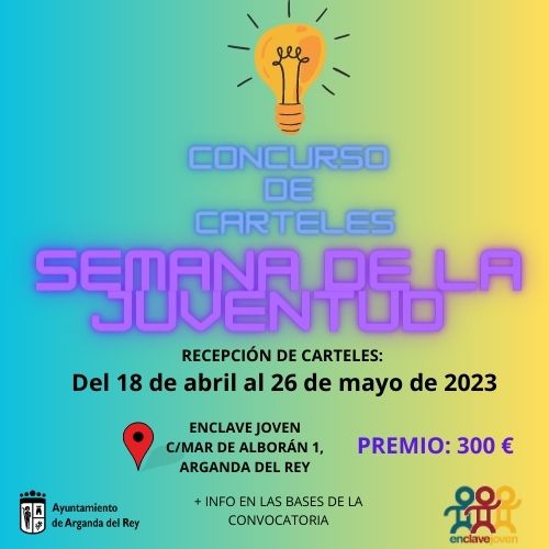 La Semana de la Juventud celebra una nueva edición del 26 de junio al 2 de julio, motivo por el cual el Ayuntamiento, a través de su Concejalía de Juventud e Infancia, convoca el V Concurso de Carteles, cuyo ganador recibirá un premio de 300 euros en metálico. Además, el trabajo premiado será la imagen oficial de la Semana de la Juventud de Arganda del Rey 2023. Podrán participar personas de entre 14 y 35 años -los menores de edad deberán adjuntar autorización de su padre, madre o tutor legal-, presentando como máximo un cartel (todos ellos serán expuestos durante el mes de junio) que deberá entregarse en el Enclave Joven hasta el próximo 26 de mayo, siendo el horario de lunes a viernes de 10:00 a 14:00 y de 17:00 a 20:00 horas.