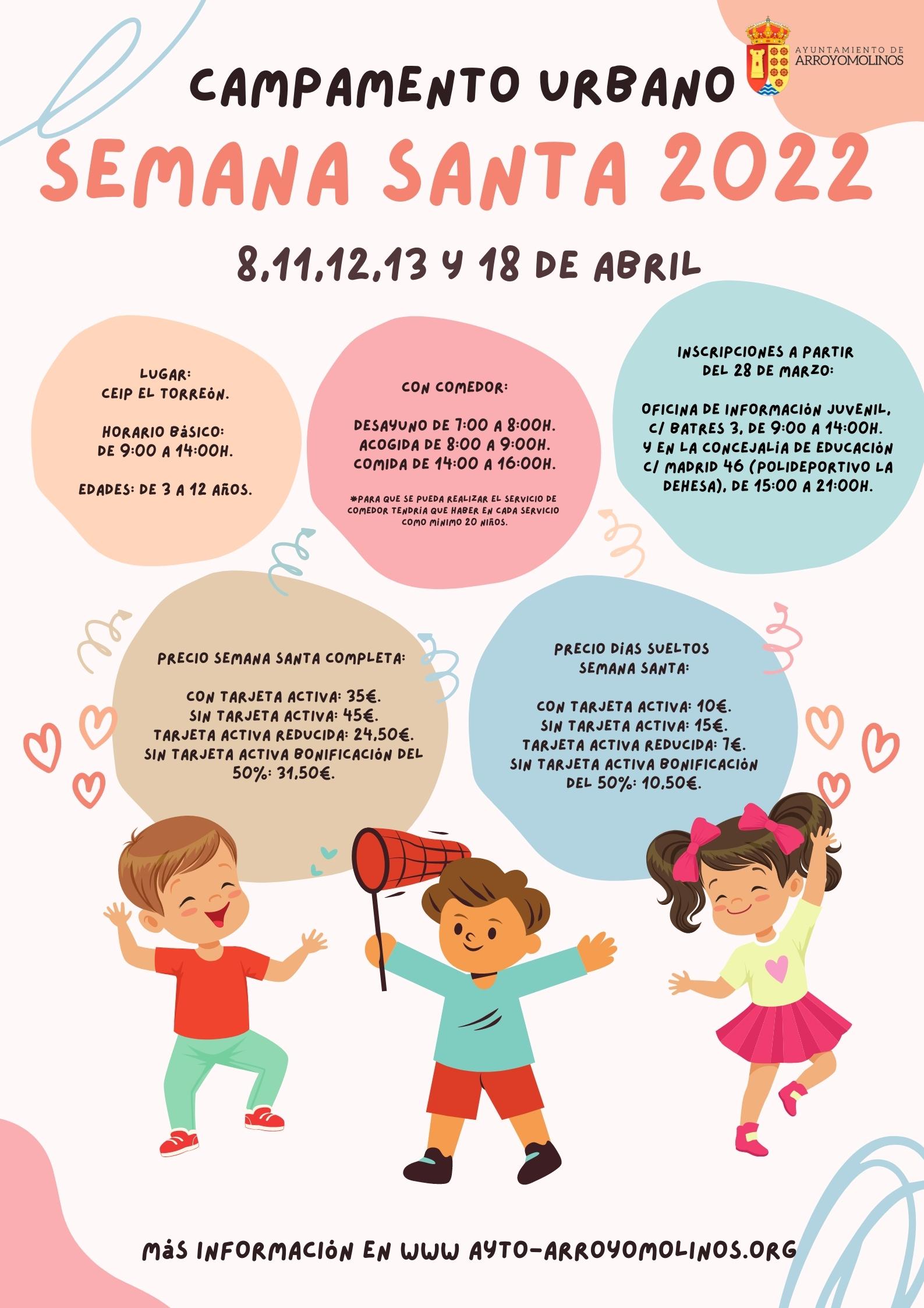 El ayuntamiento de Arroyomolinos organizará el Campamento Urbano Semana Santa 2022 para los mas pequeños los día 8, 11, 12, 13 y 18 de abril. El lugar donde se realizará el campamento será el CEIP El Torreón. Las edades para participar en el proyecto son 3 a 2 años y contará con comedor y supervisión completa durante las actividades.