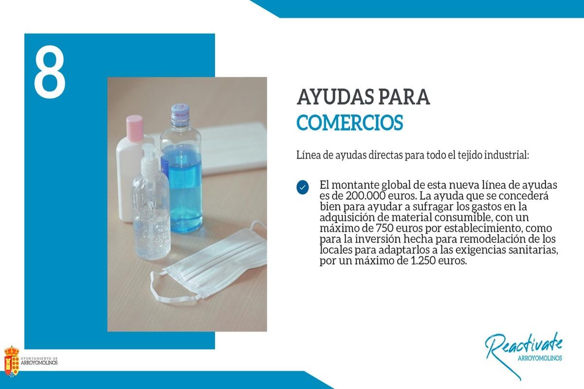 El Ayuntamiento de Arroyomolinos ejecuta una nueva línea de ayudas para sufragar las adquisiciones de material, las obras destinadas al acondicionamiento y adaptación de locales y establecimientos comerciales a las exigencias sanitarias derivadas de la pandemia, para los autónomos, pymes y comercios del municipio.