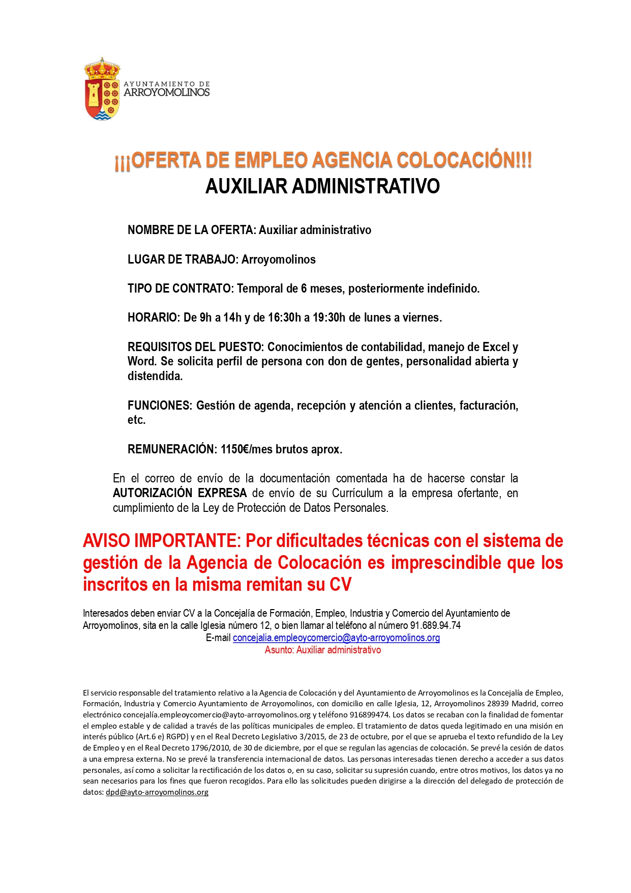 Para inscribirse es necesario enviar el CV a la concejalía de Formación, Empleo, Industria y Comercio, ubicada en la calle Iglesia número 12, o bien llamar al número de teléfono 91 689 94 74. Si se remite la documentación al correo electrónico de contacto, concejalia.empleoycomercio@ayto-arroyomolinos.org, en el asunto debe figurar el concepto del puesto vacante: AUXILIAR ADMINISTRATIVO. Por dificultades técnicas con el sistema de gestión de la Agencia de Colocación, es imprescindible que los candidatos inscritos remitan su Currículum. En el correo de envío de la documentación comentada ha de hacerse constar la autorización de envío de su CV a la empresa ofertante, en cumplimiento de la Ley de Protección de Datos Personales.