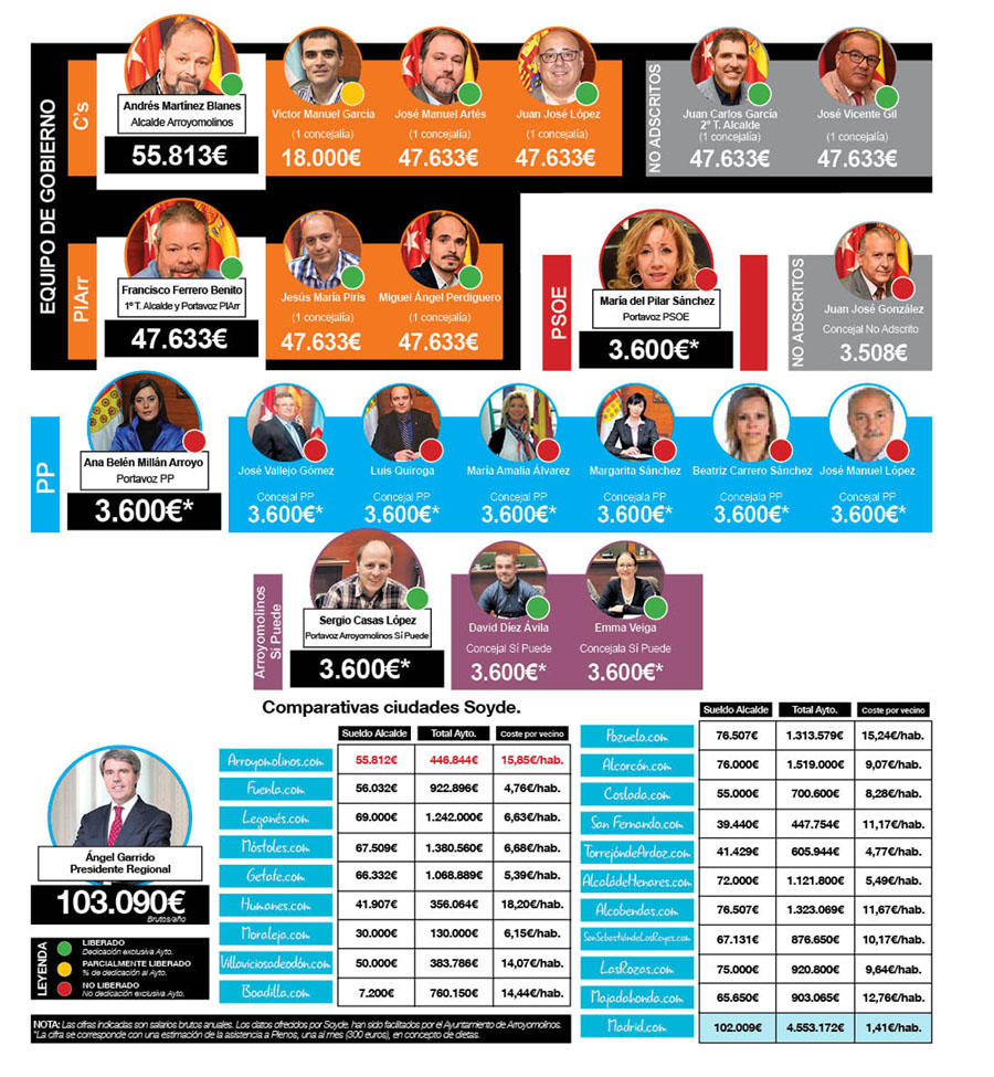 SoydeArroyomolinos.com, de nuevo, ha querido trasladar en este reportaje el salario mensual de todos los concejales que conforman la Corporación municipal de Arroyomolinos y el gasto total que supone para las arcas del consistorio el pago de sus retribuciones y lo que pagamos cada ciudadano al año por que dirijan y gestionen nuestra ciudad.