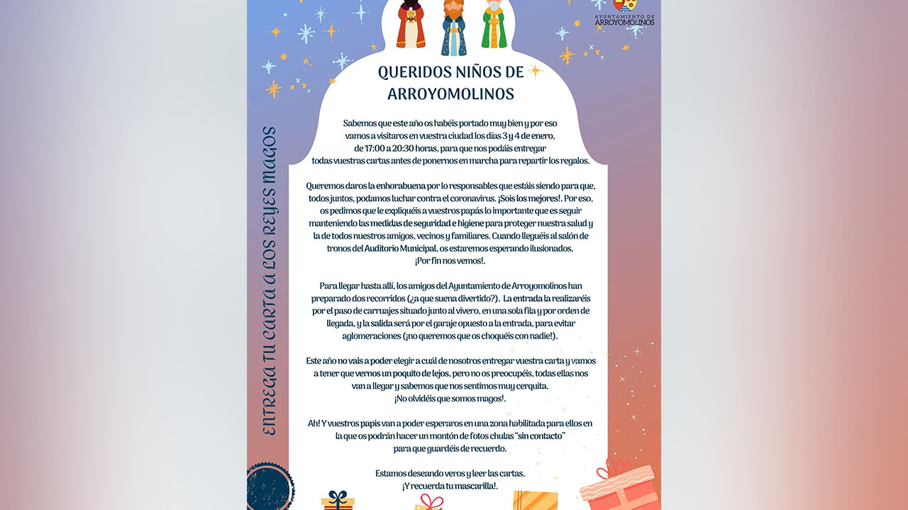 El Ayuntamiento de Arroyomolinos, directamente a través de Sus Majestades Los Reyes Magos de Oriente (Melchor, Gaspar y Baltasar), ha publicado un mensaje, en donde se informa que se van a seguir varias medidas de seguridad durante la entrega de la carta en el "Salón de Tronos" del Auditorio Municipal (Sito en la Calle Madrid Nº25) los días 3 y 4 de enero, en horario de 17:00 a 20:30 horas. El mensaje de Los Reyes Magos es el siguiente: