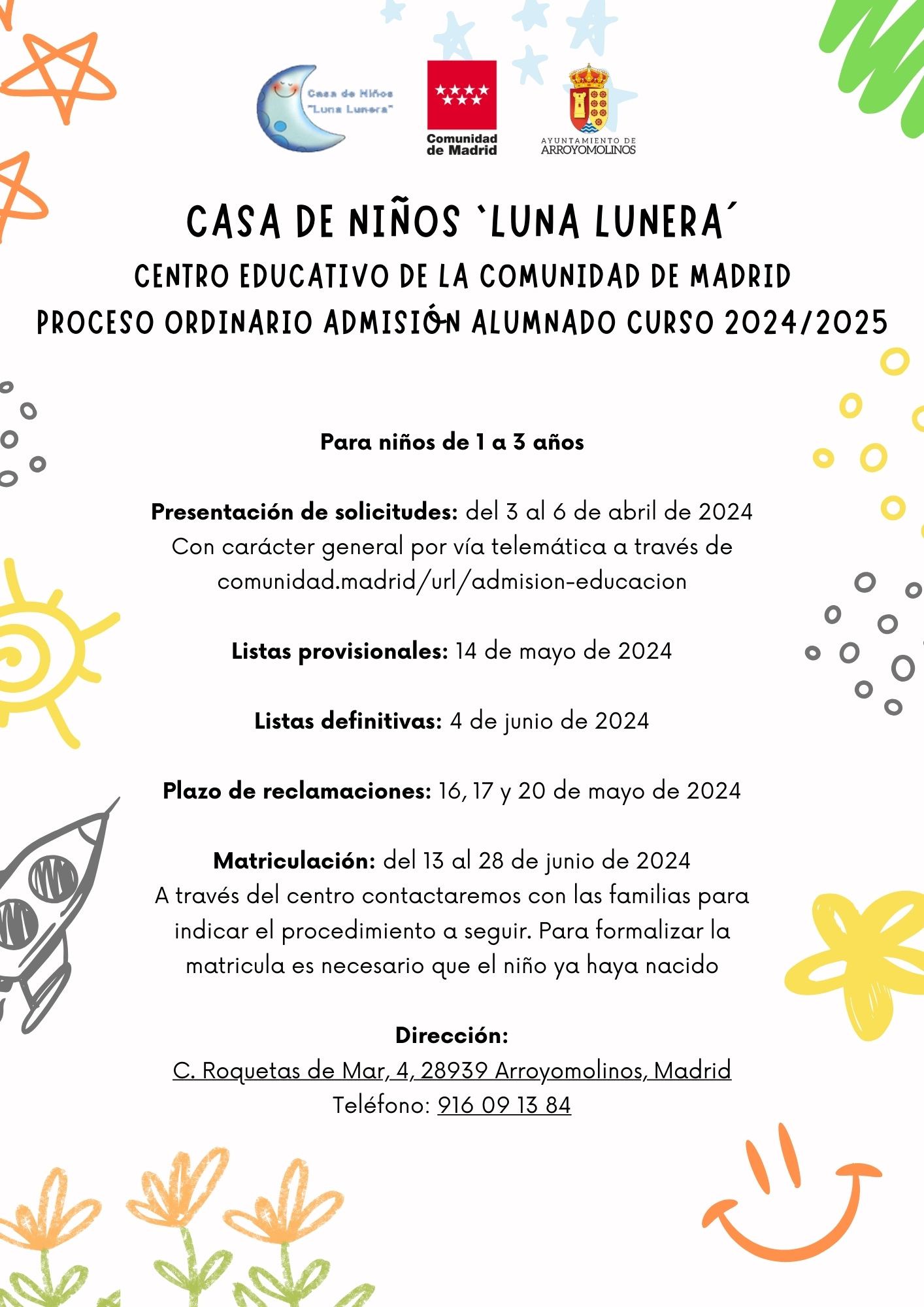 La Casa de Niños 'Luna Lunera' ya se encuentra en el proceso ordinario de admisión del alumnado para el curso 2024/2025. El plazo para presentar las solicitudes para inscribir a los menores tuvo lugar del 3 al 6 de abril. Una vez acabado el proceso de presentación, comenzará el de selección para publicar las listas. Las provisionales se podrán ver a partir del 14 de mayo, y las definitivas saldrán el 4 de junio. Quien no esté conforme con el contenido, podrá reclamar los días 16, 17 y 20 de mayo.