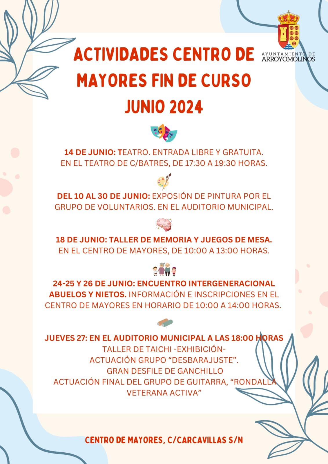 El Ayuntamiento de Arroyomolinos ha organizado para el mes de junio actividades dedicadas a los más mayores y también a sus familias. El Centro de Mayores es el espacio escogido para albergar un programa variado y dedicado a este colectivo: del 10 al 30 de junio estará abierta una exposición de pintura del grupo de voluntarios en el Auditorio Municipal, mientras que el día 18 los asistentes podrán participar en un taller de memoria y jugar a varios juegos de mesa en horario de 10 a 13; por otro lado, el jueves 27 de junio habrá un taller de Taichi, un desfile de ganchillo, y las actuaciones de los grupos "Desbarajuste" y "Rondalla Veterana Activa".