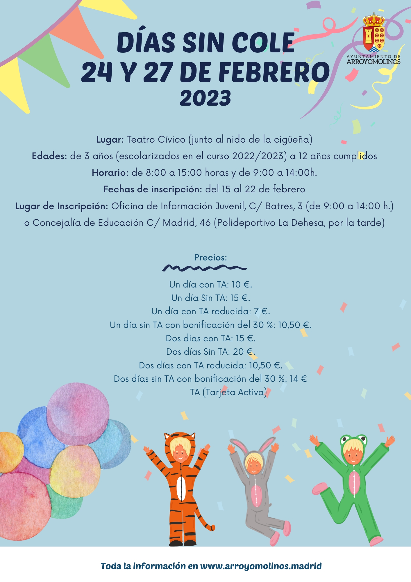 Si te toca trabajar en el Puente de Carnaval y necesitas conciliar, la alternativa "Días sin cole" te ayuda: tus peques podrán divertirse con distintas actividades que se desarrollarán los días 24 y 27 de febrero en el Teatro Cívico (junto al nido de la cigüeña), en horario de 8 a 15 o de 9 a 14. La iniciativa está dirigida a niños y niñas de 3 años (escolarizados en el curso académico 2022/2023) hasta los 12 cumplidos.