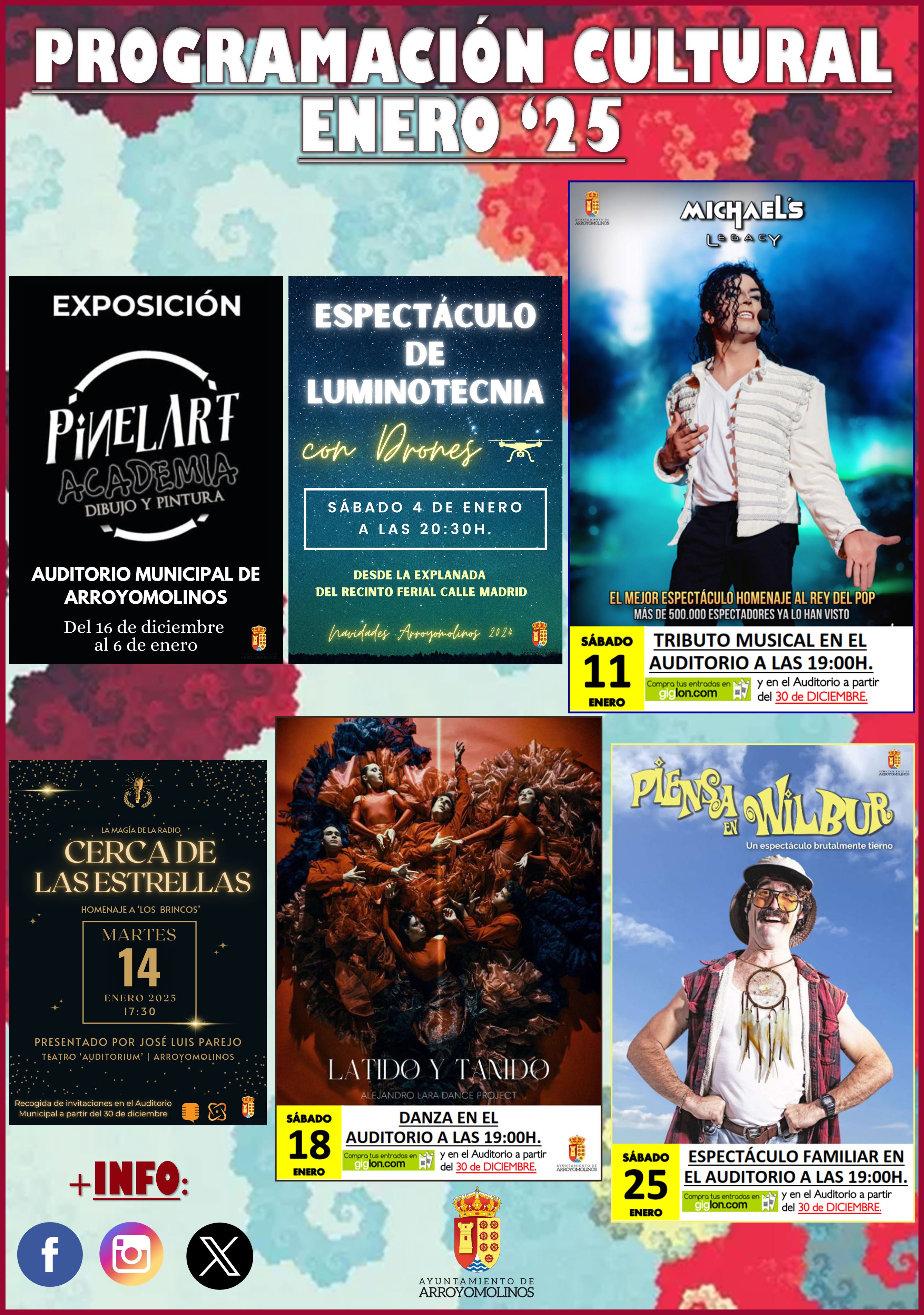 En 2025 la programación cultural continúa con nuevas propuestas para todos los gustos. El año arranca con un espectáculo de luminotecnia con drones, el cual tendrá lugar el sábado 4, a las 20.30 horas, en la explanada del Recinto Ferial (C/ Madrid). El día 11 será el turno de Michael's Legacy, considerado el mejor tributo-homenaje al Rey del Pop, mientras que el 18 de diciembre se podrá disfrutar de 'Latido y Tañido', un proyecto de danza a cargo de Alejandro Lara. El sábado 25 se destinará a un público familiar con 'Piensa en Wilbur'.