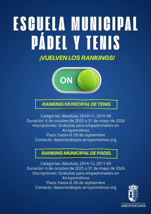 ¡Vuelven los rankings municipales de tenis y pádel en Arroyomolinos! Desde el consistorio, a través de sus redes sociales, han anunciado el regreso de este evento que se celebrará desde el 6 de octubre hasta el 31 de mayo de 2026.