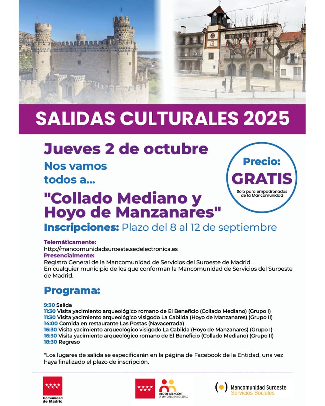 Las personas empadronadas en los municipios que integran la Mancomunidad del Suroeste podrán disfrutar el 2 de octubre de una salida cultural gratuita a los yacimientos arqueológicos de El Beneficio (de origen romano, situado en Collado Mediano) y La Cabilda (restos visigodos ubicados en Hoyo de Manzanares).
